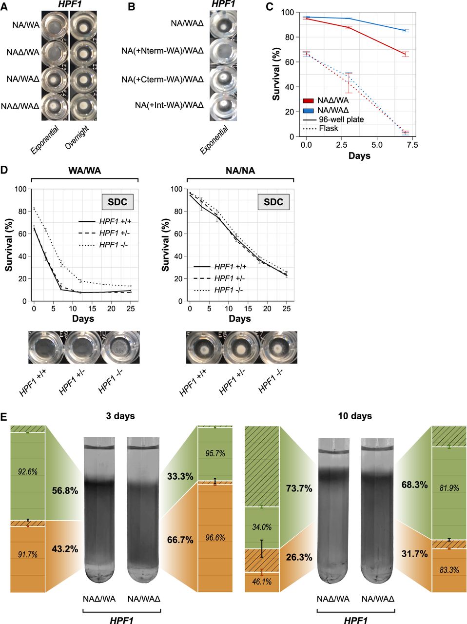 Buoyancy triggered by HPF1 N-terminal repeat expansions shortens life span. (A,B) Buoyancy of cells cultivated for 7 h (exponential phase) or overnight in calorie-rich medium in a 96-well plate. (A) HPF1 hemizygotes. (B) HPF1 allele swaps (as described in Fig. 3C). (C) Comparing CLS of HPF1 hemizygote cells cultivated in shake flasks and 96-well plates. Shake flasks had a 1:5 medium/volume ratio and were shaken at 220 rpm. Ninety-six-well plates were filled with 200 µL medium, with no shaking. (D) CLS and buoyancy (96-well plates; exponential phase) of WA and NA homozygotes parents with no (full line), 1 (dashed lines), or both copies (dotted lines) of HPF1 deleted in calorie-rich medium. (E) Percoll density gradients with HPF1 hemizygotes incubated in SDC media in a 96-well plate for either 3 d (left panel) or 10 d (right panel). The upper (nonquiescent cells) and lower (quiescent cells) phases were isolated by pipetting. The fraction (bold) and viability (italics) of cells in each phase were measured by flow cytometry (bar plots). Green: Upper/nonquiescent fraction, orange: lower/quiescent fraction, hatched area: dead cell fraction.