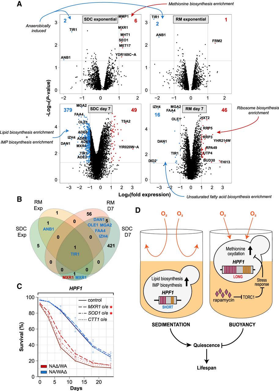 HPF1-induced buoyancy reprograms methionine, lipid, and purine metabolism. (A) Transcriptome changes induced by WA-HPF1-dependent buoyancy. NA/WA hybrids hemizygotes for WA or NA-HPF1 were cultivated in calorie-rich (left panels) or rapamycin (right panels) medium, and RNA was extracted and sequenced from exponential phase (top panels) or aging (bottom panels; 7 d after entry into quiescence) cells. y-axis: −log10 (P-value), x-axis: log2 (HPF1 NAΔ/WA) – log2 (HPF1 NA/WAΔ). Blue: transcripts more (>2×, P < 0.05) abundant in HPF1 NA/WAΔ, red: transcripts more (>2×, P < 0.05) abundant in HPF1 NAΔ/WA. The total number of transcripts passing each criterion are reported (top corners, blue and red text). Gene Ontology classifications enriched among transcripts passing each criterion are indicated (blue and red arrows) (Supplemental Table S5). (B) Comparing the number of transcripts more (>2×, P < 0.05) abundant in HPF1 NA/WAΔ (blue) or in HPF1 NAΔ/WA (red) across environments (SDC and RM, in exponential phase and after 7 d of aging [D7]). (C) CLS of HPF1 reciprocal hemizygotes overexpressing (o/e) either MXR1 (dashed), SOD1 (dot-dashed), or CTT1 (dotted) in SDC media in 96-well plate. Red asterisk indicates significance (P < 0.05 unpaired Student's t-test) at 7 d (MXR1) and 12 d (MXR1 and SOD1). (D) Model for how the intragenic tandem repeat expansions in WA-HPF1 shortens the life span by shifting cells from a sedentary (left) to a buoyant lifestyle (right), exposing them to more oxygen and causing mild oxidation of, in particular, methionine, which impairs entry into quiescence. Rapamycin prevents the accumulation of oxidized methionine, possibly through inhibiting TORC1 and through the activation of stress response genes.