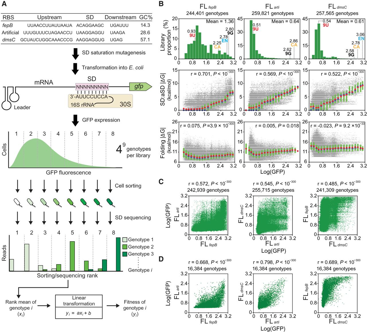 G-P associations of the SD fitness landscapes. (A) Determining SD G-P associations. SD libraries under three RBS contexts are generated and assayed in E. coli. Cell sorting divides a library into multiple ranks based on GFP expression. The genotypic composition of each rank is revealed by Illumina sequencing. The fitness (Log[GFP]) of a genotype is determined by its read count distribution transformed through a linear equation describing the correlation between the rank means and GFP fluorescence. (B) Distribution of the fitness of genotypes (upper) and its correlations (Pearson's r, t-test) with SD:aSD base-pairing energy (ΔG, middle) and mRNA folding energy (ΔG, lower). ΔG (predicted values ≤0) is shown as absolute values for simplicity. Genotypes are ranked by fitness and grouped into 20 equal-sized bins. Group means, medians, and interquartile ranges of ΔG are shown as red circles, blue circles, and green bars, respectively. The fitness of canonical SD (CA), endogenous SD (EN), and genotypes made of nine guanines (9G) and nine uracils (9U) is shown. (C) Phenotypic correlation (Pearson's r, t-test) of 9-nt SD genotypes between fitness landscapes. (D) Phenotypic correlation (Pearson's r, t-test) of 7-nt SD genotypes. The 9-nt SD genotypes of each fitness landscape are divided into 47 7-nt genotypic subsets according to the sequence located 7–13 nt upstream of the start codon. The mean fitness of 9-nt genotypes in each 7-nt subset is computed and compared between fitness landscapes.