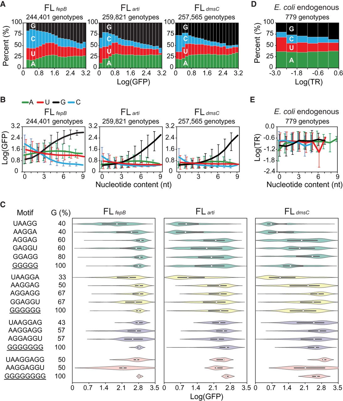 Biochemical properties of the SD sequence. (A) Relationship between fitness (Log[GFP]) and nucleotide composition. Genotypes are ranked by fitness and grouped into 20 equal-sized bins. (B) Relationship between the nucleotide content and fitness. Genotypes are ranked by the amount of each nucleotide type and grouped into 10 bins (i.e., 0–9 nt). Lines and bars indicate group means and standard deviations of fitness, respectively. (C) Influence of sequence motifs on fitness. The fitness distribution of genotypes bearing 5- to 8-nt poly(G) tracts (underlined) or canonical SD motifs is shown as violin plots, where medians and interquartile ranges are indicated by white circles and black lines, respectively. (D) Relationship between the translation rate (TR; ribosomes/s) and nucleotide composition of endogenous SD sequences in E. coli (Gorochowski et al. 2019). Genotypes are ranked by TR and grouped into six equal-sized bins. (E) Relationship between the nucleotide content and TR of endogenous SD. Genotypes are ranked by the amount of each nucleotide type and grouped into 12 bins (i.e., 0–11 nt). Lines and bars indicate group means and standard deviations of TR, respectively. (D,E) Endogenous SD is defined as the 11-nt region 5–15 nt upstream of the start codon of a protein-coding sequence. TR is shown in the logarithmic scale to allow a direct comparison with fitness quantified in this study.