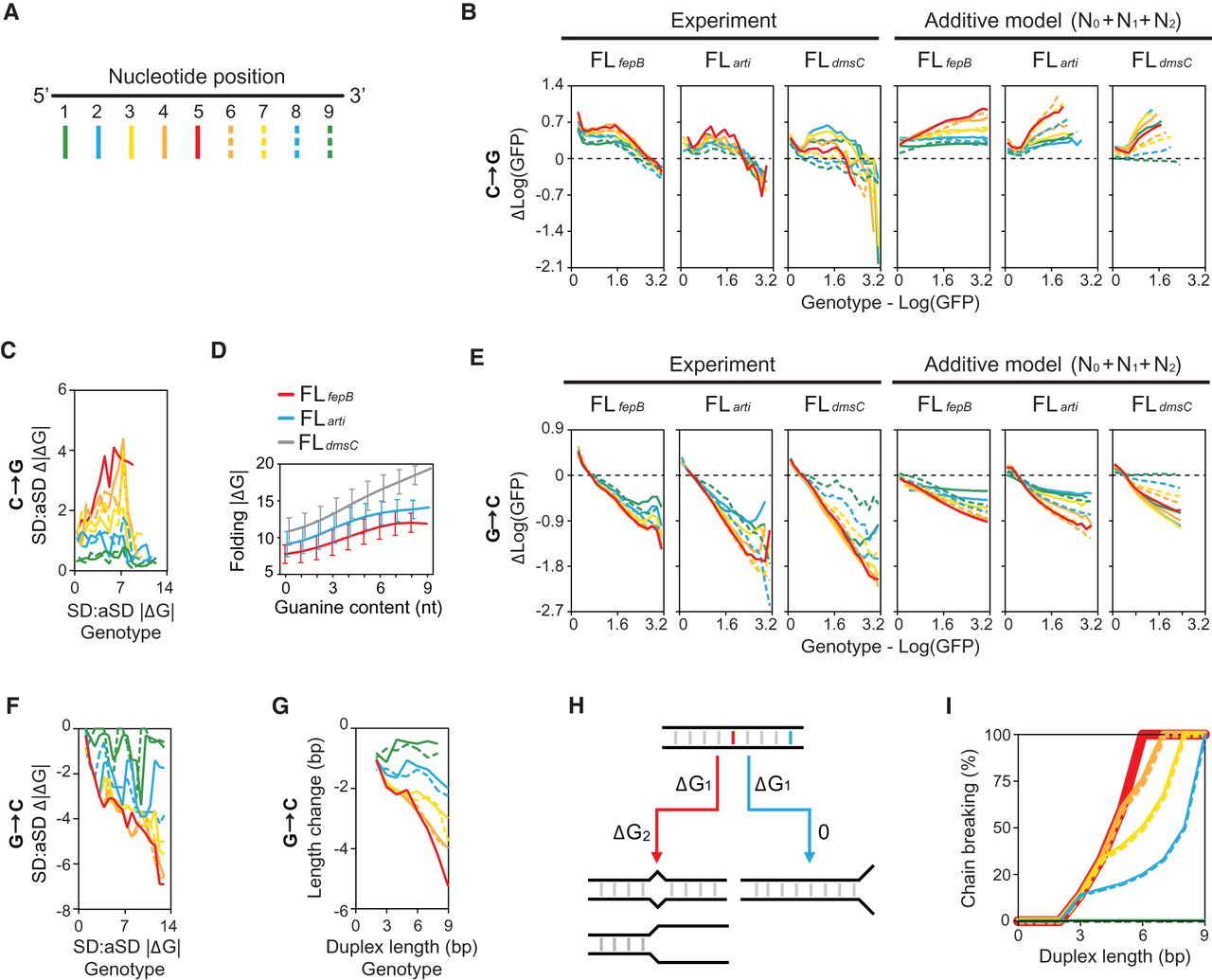 Global spectrum of mutational effects. (A) Markers of nucleotide positions. (B,C) Relationship between the fitness (Log[GFP]) (B) and SD:aSD base-pairing energy (ΔG) (C) of genotypes and the effects of C→G mutations. (D) Relationship between the guanine content of SD and the RNA folding energy (ΔG) of 30-nt RBS. Genotypes are ranked by the guanine content and grouped into 10 bins. Lines and bars indicate group means and standard deviations, respectively. (E–G) Relationship between the fitness (E), SD:aSD base-pairing energy (F), and SD:aSD duplex length (G) of genotypes and the effects of G→C mutations. (B,C,E–G) Genotypes are ranked by the considered phenotypes and grouped into 20, 20, 20, 20, and 10 equal-sized bins, respectively. For each phenotype-ranked group, the mean phenotypic effects of mutations at each nucleotide position in SD are computed and shown by lines styled according to A. (C,D,F) The predictions of ΔG are ≤0 and shown as absolute values for simplicity. (B,E) The additive model predicts mutational effects based on the fitness contribution of RBS contexts (N0), single nucleotides (N1), and pairwise epistasis (N2). (H) Chain-breaking model. Mismatch mutations occurring at the internal (red) and the edge (blue) of a RNA duplex are highlighted: (ΔG1) energy penalty caused by base-pairing mismatches; (ΔG2) energy penalty caused by breaking the base-pairing chain. (I) Probability of chain-breaking mutations as a function of the nucleotide position and the duplex length formed by two 9-nt position-aligned RNA strands made of any sequences. The chain-breaking probability at each nucleotide position is shown by lines styled according to A.