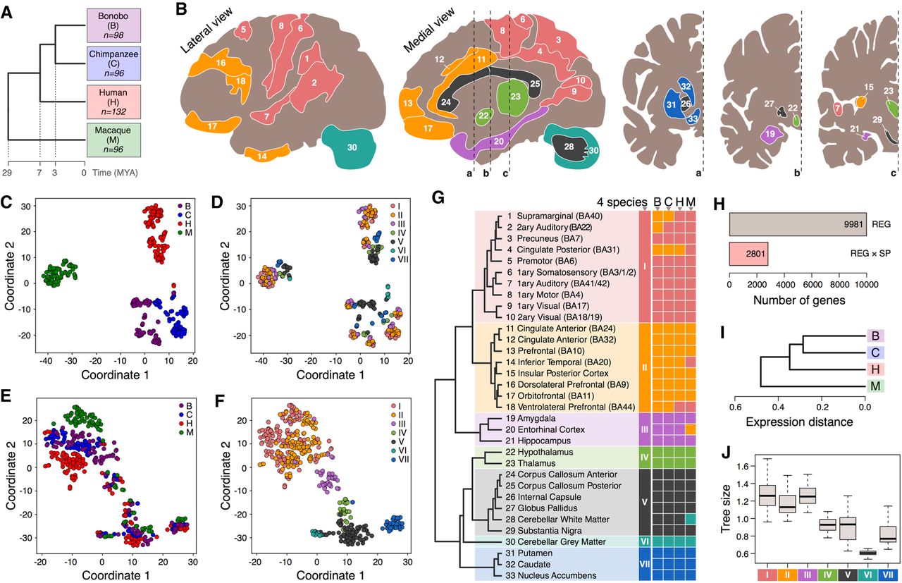 Gene expression variation analysis in 33 brain regions. (A) Phylogenetic relationship among analyzed species. Numbers indicate the number of analyzed brain samples. (B) Anatomical localization of 33 analyzed brain regions within the human brain. Colors represent expression-based regional clusters, defined in G. (C–F) t-SNE plots based on expression variation among all 422 analyzed samples: (C,D) the total variation; (E,F) the residual variation after removal of the average species’ and individual differences. Each circle represents a sample. Circle colors represent species (C,E) or expression-based regional clusters (D,F). (G) Unsupervised hierarchical clustering of brain regions based on the average gene expression values of all 11,176 detected genes in four species. Regions within each species are assigned to the nearest cluster. The clustering based on each individual sample is shown in Supplemental Figure S3. (H) Numbers of genes differentially expressed among brain regions (REG), or among species with a significant dependence on the region (REG × SP) in ANOVA. (I) Average phylogenetic tree reconstructed based on the expression differences identified using ANOVA with species and regions used as factors. The trees reconstructed for each brain region are shown in Supplemental Figure S5. (J) Total branch length calculated for the reconstructed phylogenetic trees for each of the 33 brain regions grouped by expression-based regional clusters I–VII, defined in G.