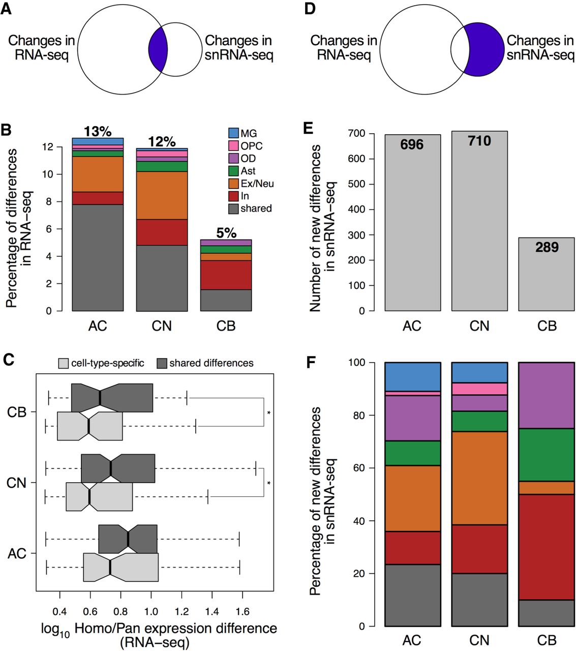 Gene expression differences detected by snRNA-seq and bulk RNA-seq. (A) Schematic representation and (B) percentage and the cell type specificity of the expression differences present in bulk RNA-seq and snRNA-seq, defined as absolute greater than twofold difference in human samples compared to a pool of chimpanzee and bonobo samples (Methods). (C) The amplitude of expression differences detected in one (specific) or multiple (shared) cell types in bulk RNA-seq. (*) P < 0.05, one-sided t-test. (D) Schematic representation, (E) numbers, and (F) cell type specificity of the expression differences solely detected by snRNA-seq. Color as in A.
