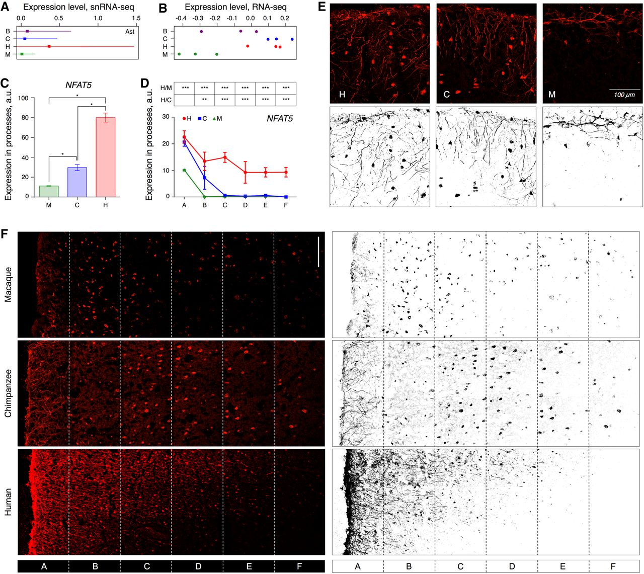Gene expression differences detected by IHC. (A) The mean log10-transformed expression level of NFAT5 mRNA in AC astrocytes (squares), and the standard deviation of the mean (horizontal lines). (B) The log10-transformed read counts normalized for the median of NFAT5 mRNA in bulk AC data. Circles indicate individual samples. Average fluorescent intensities of NFAT5 IHC signal in the astrocytic processes of macaques, chimpanzees, and humans across cortical layers (C) and at different cortical depth (D). Error bars show the standard deviation of the mean. (***) P < 0.0005; (**) P < 0.005; (*) P < 0.05, two-sided t-test, Holm-Sidak correction; (H/C) human-chimpanzee comparison; (H/M) human-macaque comparison. Symbols indicate cortical sections located at increasing depth, depicted in panel F. (E) IHC (upper) and its binarized representation (lower) of NFAT5 protein in the uppermost layer of AC sections. (F) Immunostaining (left) and its binarized representation (right) of NFAT5 protein in the three upper layers of AC sections in macaques, chimpanzees, and humans (for GFAP and DAPI staining of these sections, see also Supplemental Figs. S45–S49). Sections A–F indicate segmentation areas used in the analysis presented in panel D. (Scale bar) 100 µm.