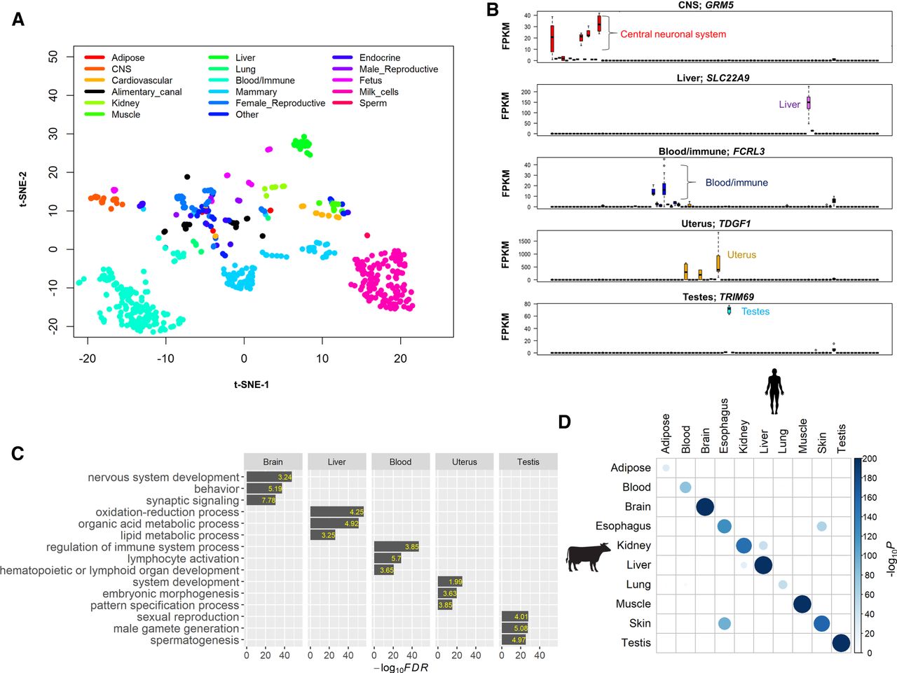 General characteristics of the cattle gene atlas. (A) Clustering analysis of all 723 RNA-seq samples using t-SNE (t-Distributed Stochastic Neighbor Embedding) procedure. (CNS) Central neural system. (B) Examples of tissue-specific genes in brain (GRM5), liver (SLC22A9), white blood cells (FCRL3), uterus (TDGF1), and testes (TRIM9). The y-axis is the raw gene expression, that is, fragments per kilobase per million mapped reads (FPKM). (C) Gene Ontology enrichment analysis of tissue-specific genes (the top 5% of genes based on t-statistics). The value in each bar is the fold of enrichment. (D) The enrichment analysis of cattle tissue-specific genes with human tissue-specific genes. The P-value is obtained using a hypergeometric test.