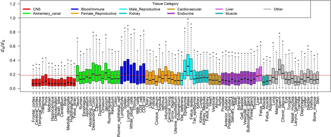 Comparison of dN/dS ratios of tissue-specific genes across all the 91 tissues and cell types between human and cattle. The red line represents the averaged dN/dS ratio of all orthologous genes between human and cattle. For each tissue, we compared tissue-specific genes of this tissue against the remaining genes using a two-tailed t-test; (*) P < 0.01.