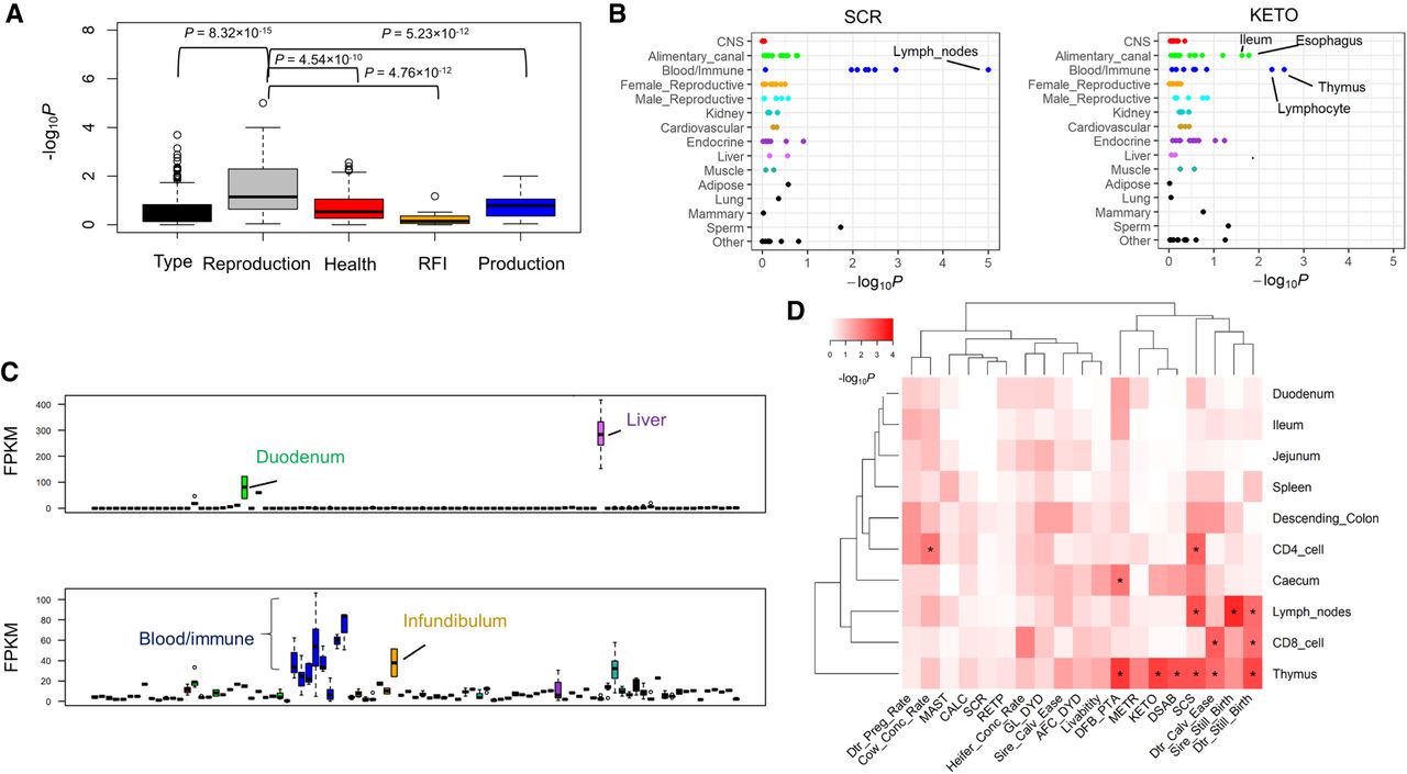 Associations of male reproduction and health traits with blood and immune tissues and cell types. (A) Reproduction traits have a significantly higher GWAS signal enrichment (−log10P) than other types of traits in blood/immune tissues. We calculate P-values between groups using Student's t-test. (B) Enrichments of tissues and cell types with sire conception rate (SCR) and ketosis (KETO) disease. (C) Expression patterns of two fine-mapped genes across all 91 tissues and cell types, C6 (top; PPC = 1 for somatic cell score [SCS]) and CCDC88C (bottom; PPC = 1 for day of first birth [DFB]). (D) Associations of male reproduction and health traits with blood/immune tissues and cell types and four intestinal parts based on the GWAS signal enrichments of tissue-specific genes detected within these immune-relevant tissues and cell types. (*) Corrected-P (FDR) < 0.05.