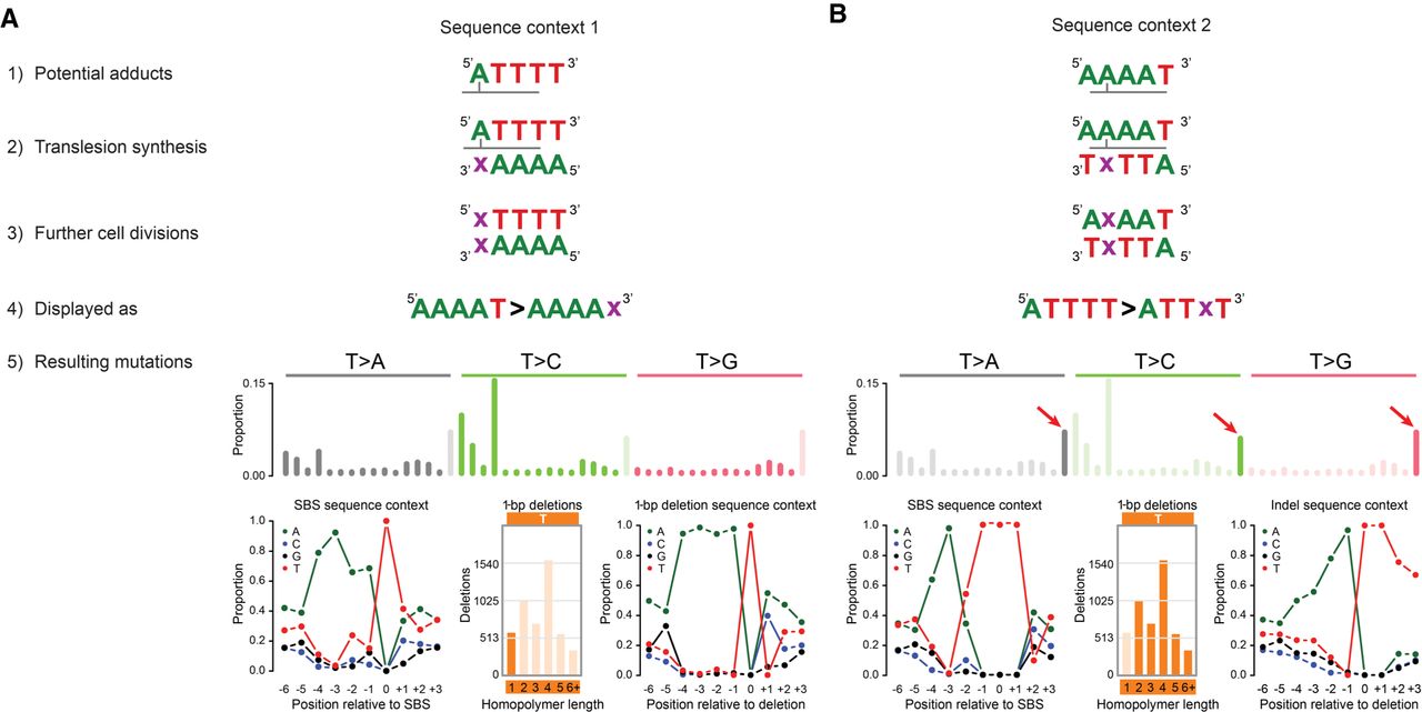 Proposed model for adduct formation leading to the mutation patterns of SBS_AnT and ID_AnT. (A) Potential adduct 1. (1) Adducts are formed on adenines directly 5′ of thymine homopolymers. (2) During translesion synthesis, an incorrect nucleotide (x) is incorporated opposite the adducted adenine. (3) During further cell divisions, the mutation is maintained. (4) Following the conventions of the mutational signature field, we display mutations as occurring from the pyrimidine of the Watson–Crick base pair. (5) Potential adduct 1 would lead to SBSs directly adjacent to TTT trinucleotides and deletions of single thymines not in thymine homopolymers. Both SBSs and deletions resulting from potential adduct 1 would be enriched for adenines up to 4 bp 5′ of the mutation site. (B) Potential adduct 2. (1) Adducts are formed in adenine homopolymers with a thymine directly 3′. (2) During translesion synthesis, an incorrect nucleotide (x) is incorporated opposite the adducted adenine. (3) During further cell divisions, the mutation is maintained. (4) Following the conventions of the mutational signature field, we display mutations as occurring from the pyrimidine of the Watson–Crick base pair. (5) Potential adduct 2 would lead to SBSs inside TTT trinucleotides and deletions of single thymines inside thymine homopolymers. SBSs resulting from potential adduct 2 would be strongly enriched for adenines 3 bp 5′ of the mutation site. Deletions resulting from potential adduct 2 would be strongly enriched for adenines up to 4 bp 5′ of the mutation site. The latter is owing to the possible different locations of the adduct inside the homopolymers. We believe that for longer homopolymers (more than three thymines), the adduct will nearly always be situated opposite the third thymine, making the −3 position (relative to the adduct) the −1 position relative to the thymine homopolymers. This explains the ∼100% presence of adenines directly 5′ of the thymine homopolymers.