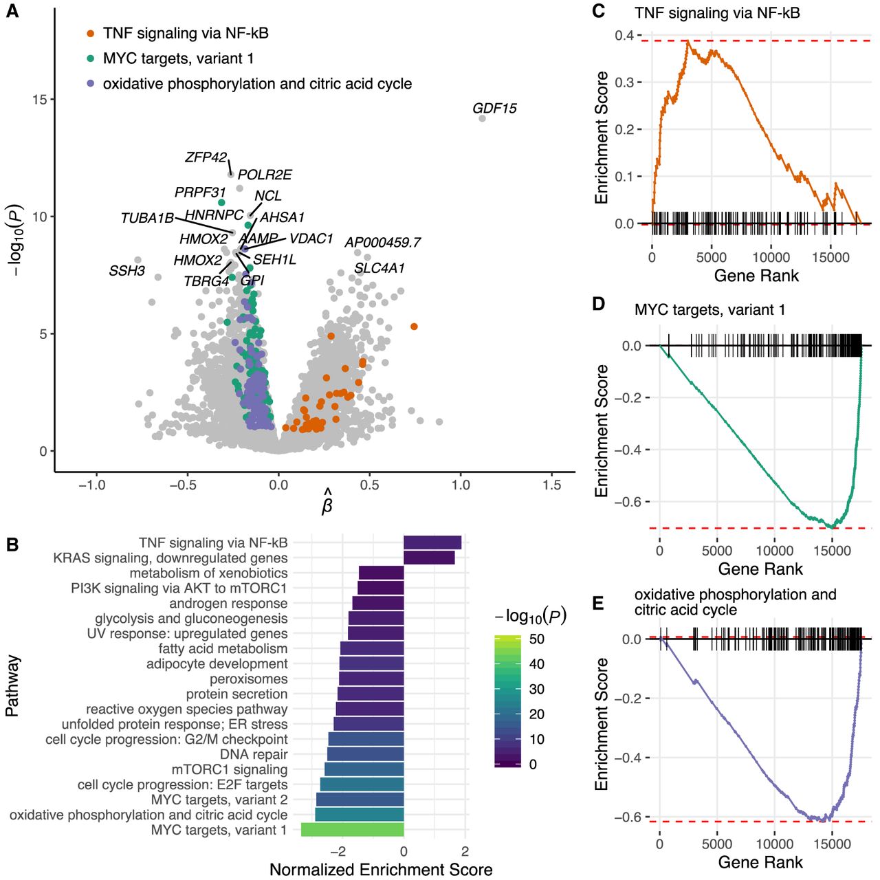 Transcriptional responses to aneuploidy in human embryos. (A) Volcano plot depicting differential expression between euploid and aneuploid cells. Positive values indicate increased expression in aneuploid cells, whereas negative values indicate reduced expression. (B) Hallmark gene sets from the Molecular Signatures Database (MSigDB) that are significantly enriched for genes that are up- or down-regulated in aneuploid cells based on gene set enrichment analysis (GSEA; 5% FDR). (C) Gene set enrichment plot demonstrating that genes regulated by NF-kB in response to tumor necrosis factor are significantly up-regulated in aneuploid cells. (D) Same as panel C, but demonstrating that MYC targets exhibit reduced expression in aneuploid cells. (E) Same as panel C, but demonstrating that genes involved in oxidative phosphorylation are down-regulated in aneuploid cells.