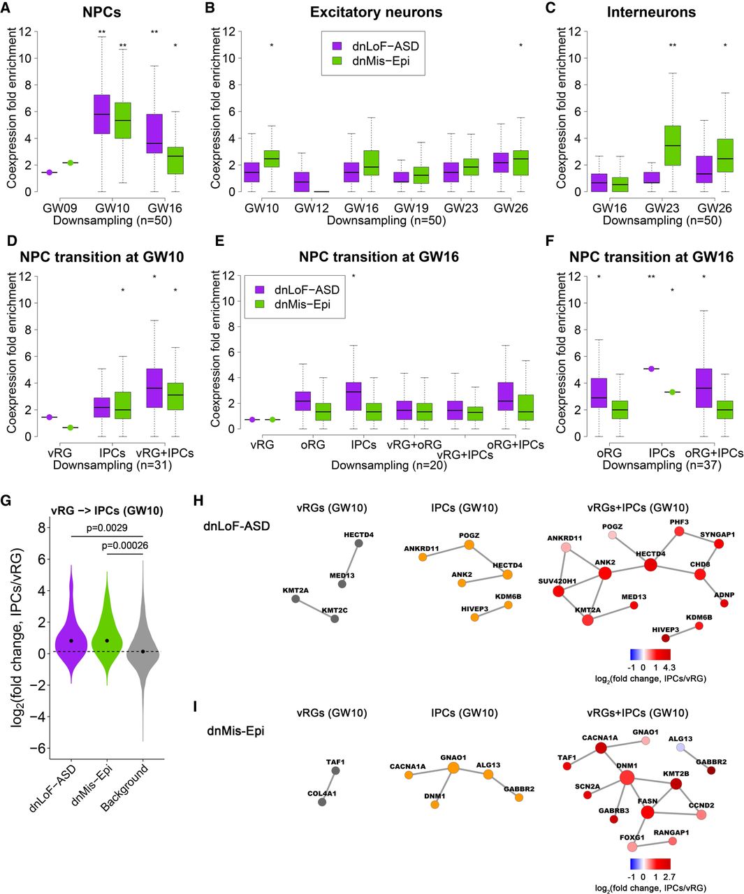 Coexpression enrichment analysis of dnLoF-ASD and dnMis-Epi genes during NPC and neuron development. (A–C) Coexpression fold enrichment of dnLoF-ASD and dnMis-Epi genes at specific stages of NPCs (A), excitatory neurons (B), and interneurons (C) by downsampling the same number of cells for each cell stage. (D) Coexpression fold enrichment of dnLoF-ASD and dnMis-Epi genes in vRG cells, IPCs, and the transition at GW10 by downsampling the same number of cells for each condition. (E,F) Coexpression fold enrichment of dnLoF-ASD and dnMis-Epi genes in vRG cells, oRG cells, IPCs, and their transitions at GW16 by downsampling 20 cells (E) and 37 cells (F) for each condition. In A–F, asterisks indicate −log10 P-values for differences in mean enrichment scores between the gene sets and the background genes (one-sided Fisher's exact test): (*) 1 ≤ −log10P < 2; (**) 2 ≤ −log10P < 5. (G) Expression of dnLoF-ASD and dnMis-Epi genes significantly increased during the transition from vRG cells to IPCs at GW10. The dashed horizontal line indicates the median log2(fold change) value of the background genes. P-values indicate differences between log2(fold change) values of dnLoF-ASD or dnMis-Epi genes and those of background genes during the transition (one-sided Wilcoxon rank-sum test). (H,I) Coexpression networks of dnLoF-ASD (H) and dnMis-Epi genes (I) in vRG cells, IPCs, and the transition at GW10 using original sample size. Node size is proportional to coexpression degree.