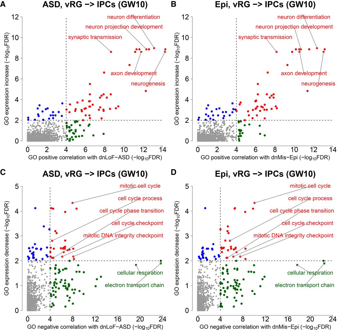 GO correlation analysis of dnLoF-ASD and dnMis-Epi genes and GO expression change analysis during the vRG-to-IPC transition at GW10. (A,B) Scatterplots show the significance values from GO positive correlation analysis of dnLoF-ASD (A) and dnMis-Epi genes (B) on the horizontal axis versus the significance values from GO expression increase analysis on the vertical axis during the transition. Dots represent individual GO biological process terms. Each dot has −log10FDR values on both the horizontal axis (how strongly genes annotated under a GO term positively correlate with dnLoF-ASD [A] and dnMis-Epi genes [B] during the transition) and the vertical axis (how much higher the log2[fold change] values are for genes annotated under the GO term compared to the background genes during the transition). The dashed vertical and horizontal lines indicate −log10FDR at 4 and 2 as significance thresholds. Red denotes GO terms significant in both analyses, green denotes GO terms significant only in GO positive correlation analysis, and blue denotes GO terms significant only in GO expression increase analysis. Selected representative GO terms are labeled. (C,D) Similar to A and B with GO negative correlation analysis of dnLoF-ASD (C) and dnMis-Epi genes (D) and GO expression decrease analysis during the transition.