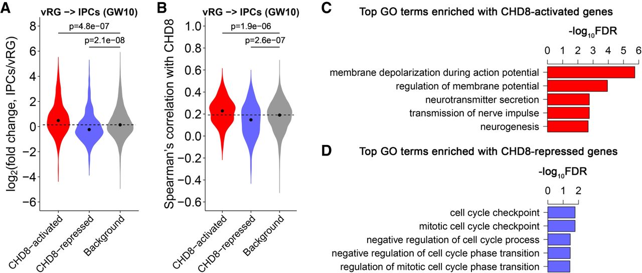 CHD8 target gene analysis. (A) Expression changes of CHD8-activated and CHD8-repressed genes during the transition from vRG cells to IPCs at GW10. The dashed horizontal line indicates the median log2(fold change) value of the background genes. P-values calculated by the one-sided Wilcoxon rank-sum test indicate whether CHD8-activated (-repressed) genes have higher (lower) log2(fold change) values than the background genes during the transition. (B) Spearman's correlation between CHD8-activated/CHD8-repressed genes and CHD8 during the transition. The dashed horizontal line indicates the median Spearman's correlation with CHD8 for the background genes. P-values calculated by the one-sided Wilcoxon rank-sum test indicate whether CHD8-activated (-repressed) genes have higher (lower) correlation with CHD8 than the background genes during the transition. (C,D) Top GO terms enriched with CHD8-activated (C) and CHD8-repressed genes (D).