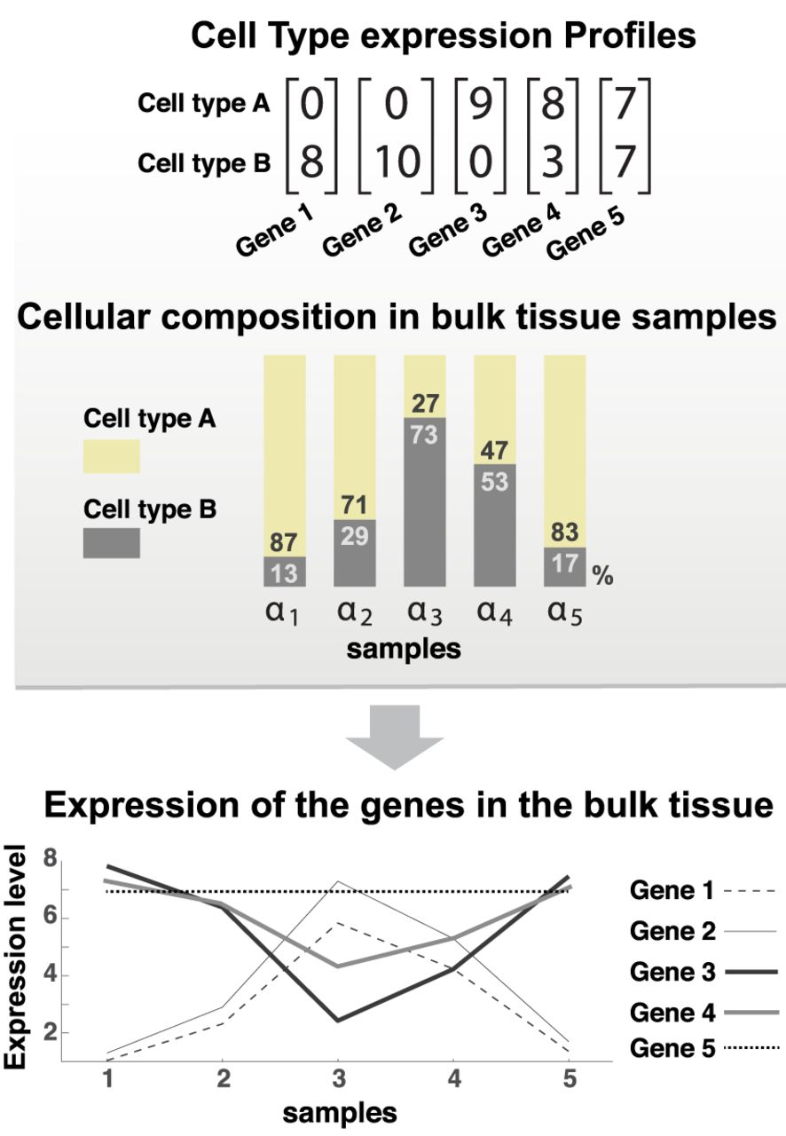 Schematic of cellular composition effects on gene expression variance in bulk tissue. Top: Cell type (CT) profiles for five genes in a hypothetical tissue with two cell types. Genes 1 and 2 are marker genes for cell type B. Gene 3 is a marker gene for cell type A. Gene 4 is expressed in both cell types but at different levels, whereas Gene 5 is expressed at equal levels. Middle: Hypothetical cellular compositions of five bulk tissue samples. Each sample αi has the same amount of biological material but different proportions of each cell type. Bottom: The expected observed expression levels. Genes 1 and 2 are positively correlated and negatively correlated with Genes 3 and 4. Gene 5 is expressed at the same level in all the bulk tissue samples as it is equally expressed in all cell types.