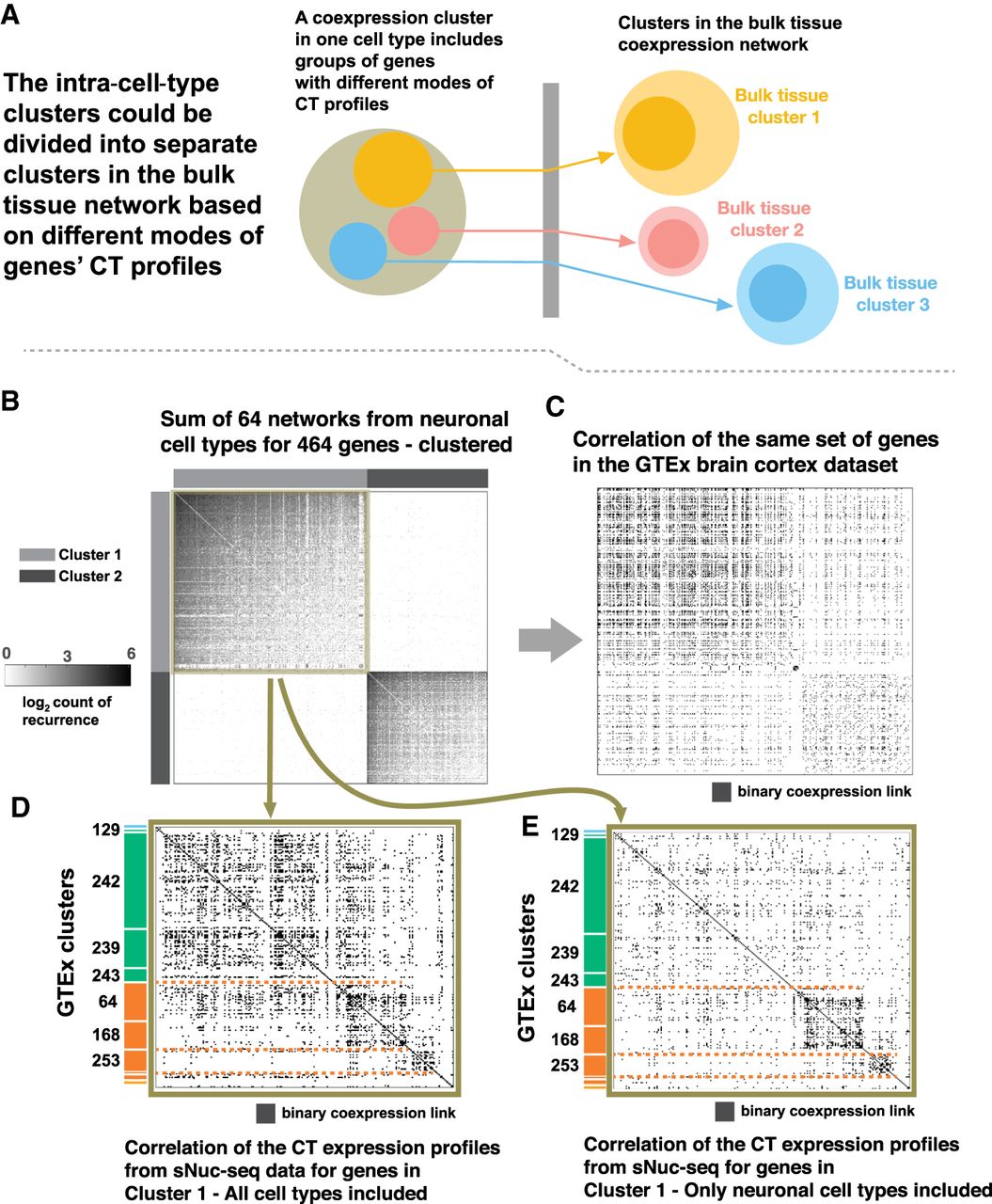 Modes of CT expression profiles shape gene clusters in the bulk tissue. (A) Schematic showing a coexpression cluster in a specific cell type could be divided into multiple clusters in the bulk tissue data set, as its genes might have different CT expression profiles. Each circle represents a group of genes. Blue, yellow, and coral represent different “modes” of CT expression profiles, similar to the mean CT expression profiles for the bulk tissue clusters in Figure 3. (B) The heat map shows part of the sum network from 64 neuronal sNuc-seq data sets where two coexpression clusters are identified. Clusters 1 and 2 (color bar gray and black) are well distinguished from each other. (C) Heat map showing the same set of genes with the same order in the GTExBulk coexpression network. Although the two clusters are somewhat distinguished, a great amount of inter-cluster links is present. (D) The heat map shows the network for the genes in Cluster 1, from the coexpression network built from the correlation of the CT expression profiles obtained from the 75 sNuc-seq data sets. Genes are ordered based on their belonging to different GTExBulk clusters, identified by the color bar and cluster IDs from Figure 3A. Three subclusters are mildly distinguished, separating two groups of housekeeping clusters from the Pyramidal clusters (orange vs. green). (E) Same plot as D, but the CT expression profiles are obtained from the 64 neuronal cell types only. The distinguished clusters demonstrate the group of genes with different expression levels in the neuronal cell types.