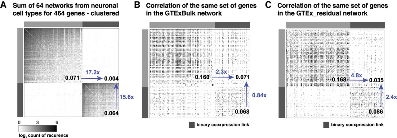 Reproducibility of robust correlation clusters from sNuc-seq networks in GTExBulk and the residual network. Inter- and intra-cluster density values are overlaid in black, and fold-changes in blue. The null density is 0.005 for all the networks. (A) Sum network as in Figure 4B. For visualization, the data are scaled to be comparable to B and C. Intra-cluster density is more than 15 times the inter-cluster density for both black and gray clusters. (B) As in Figure 4C. Intra-cluster density is less than the inter-cluster density for the black cluster; for the gray one it is less than 2. (C) Intra-cluster density is more than 10 times higher than the inter-cluster density for both black and gray clusters. Notice that the differences in the density (from GTExBulk to GTEx_residual network) is mostly explained by the relative reduction of inter-cluster links rather than an increase in the intra-cluster links.