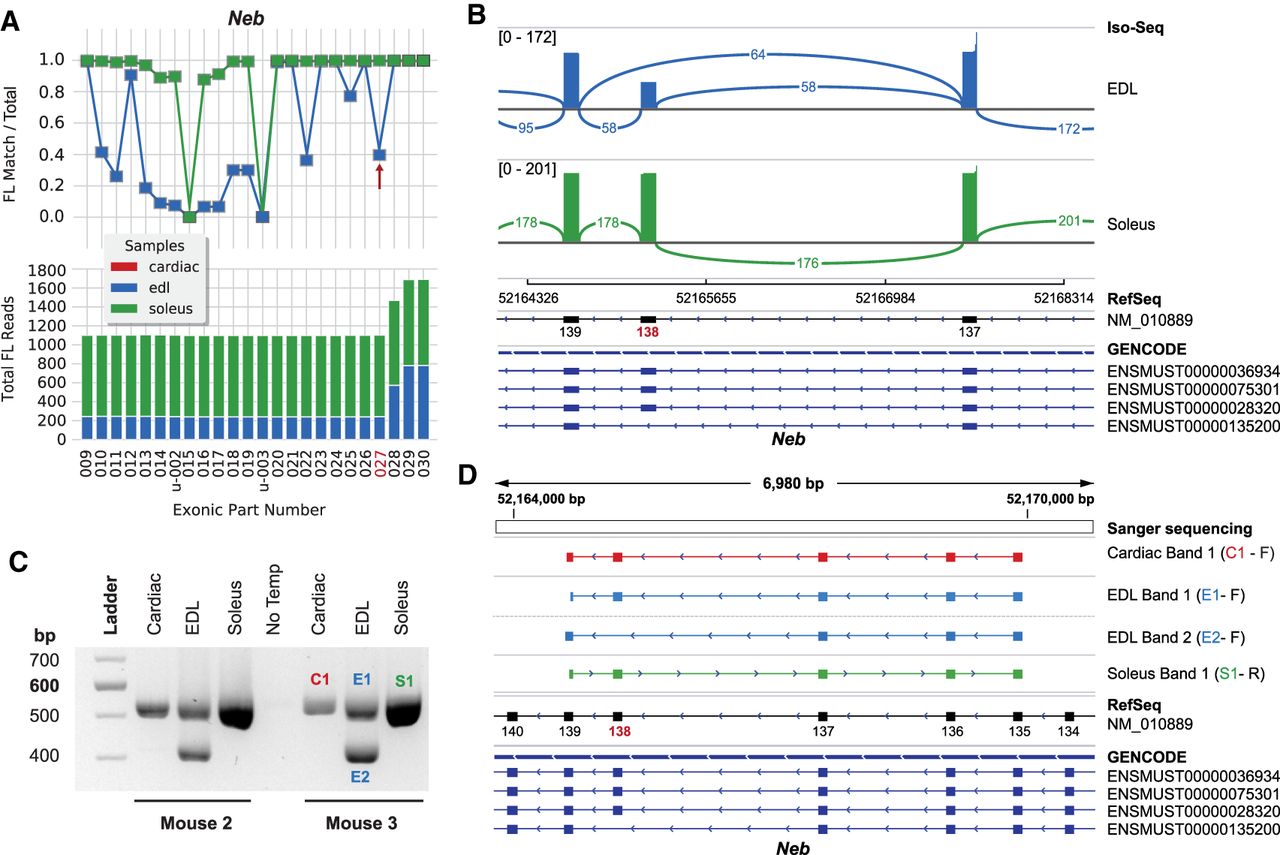 Differential usage of exon 138 of mouse nebulin. (A) Nebulin exon coverage graph (cropped) produced by exCOVator. (Bottom) Stacked bar graph displays full-length (FL) read coverage of exonic parts (EP). (Top) Line graph displays the ratio of [FL reads matching the EP/total FL reads] that overlap the EP coordinates. (B) Sashimi plot from the Integrative Genomics Viewer (IGV) displaying differential splicing of exon 138. The plot displays consensus reads from the BAM file (not FL reads). Minimum splice junction coverage = 5. (C) Agarose gel showing RT-PCR products pertaining to exon 138 from soleus, EDL, and heart. Primers target exon 135 and 139. Cardiac shows similar banding pattern as soleus; however, few reads were detected during sequencing. (D) Sanger sequencing of products cut from the gel seen in C. The top portion shows sequences aligned in IGV using the BLAT tool. Only the EDL band 2 is missing exon 138.