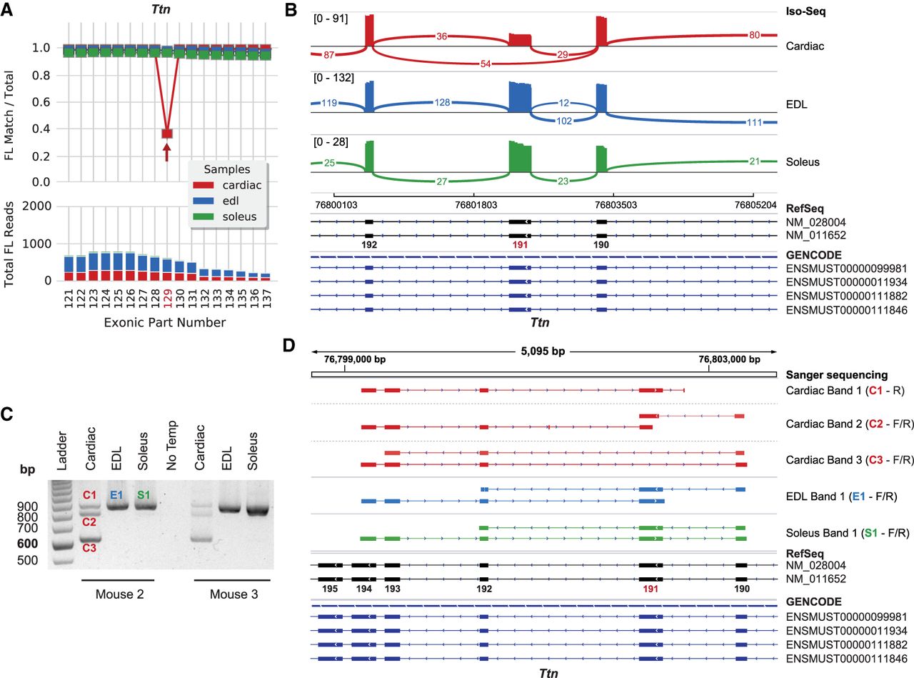 Titin exon 191, an undocumented cassette exon removed from a subset of cardiac transcripts. (A) Titin exon coverage graph (cropped) produced by exCOVator. (Top) Line graph; the red arrow points to exonic part (EP) 129 or exon 191 of NM_011652 (N2-A). (Bottom) Stacked bar graph displays full-length (FL) read coverage of EP. (B) Sashimi plot showing the same data in the Integrative Genomics Viewer (IGV). The plot shows consensus reads from the BAM file (not FL reads). Minimum splice junction coverage = 5. (C) Agarose gel of RT-PCR products from soleus, EDL, and heart. Primers target exons 189 and 194 with predicted product sizes of 882 bp (+exon 191, C1) and 615 bp (no exon 191, C3). All soleus and EDL transcripts include exon 191. Cardiac has both predicted bands and one unknown band in the middle (C2) that is likely a heteroduplex. (D) Sanger sequencing data of products from C displayed using the IGV BLAT tool. Exon 191 is missing only from cardiac band 3 (C3) and is present in all other tissues.