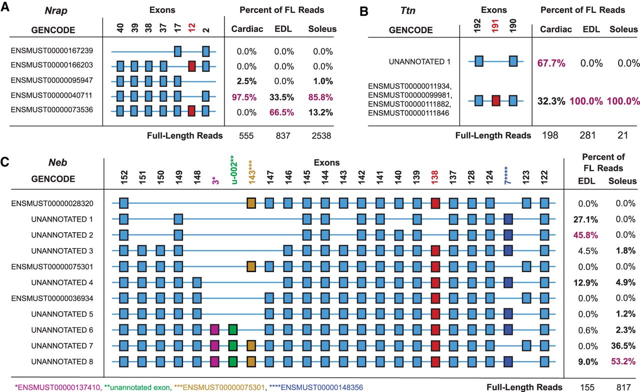 Identifying and quantifying Nrap, titin, and nebulin transcript isoforms using exPhaser. Exons highlighted as red squares were validated using RT-PCR and Sanger sequencing. (A) Nrap transcript structures. Exon numbering based on NM_008733. (B) Titin transcript structures. Exon numbering based on NM_011652. The bottom splice pattern could not be uniquely mapped to a single annotation. (C) Nebulin transcript structures. Exon numbering based on NM_010889. Some neighboring constitutively expressed exons were also included for clarity.