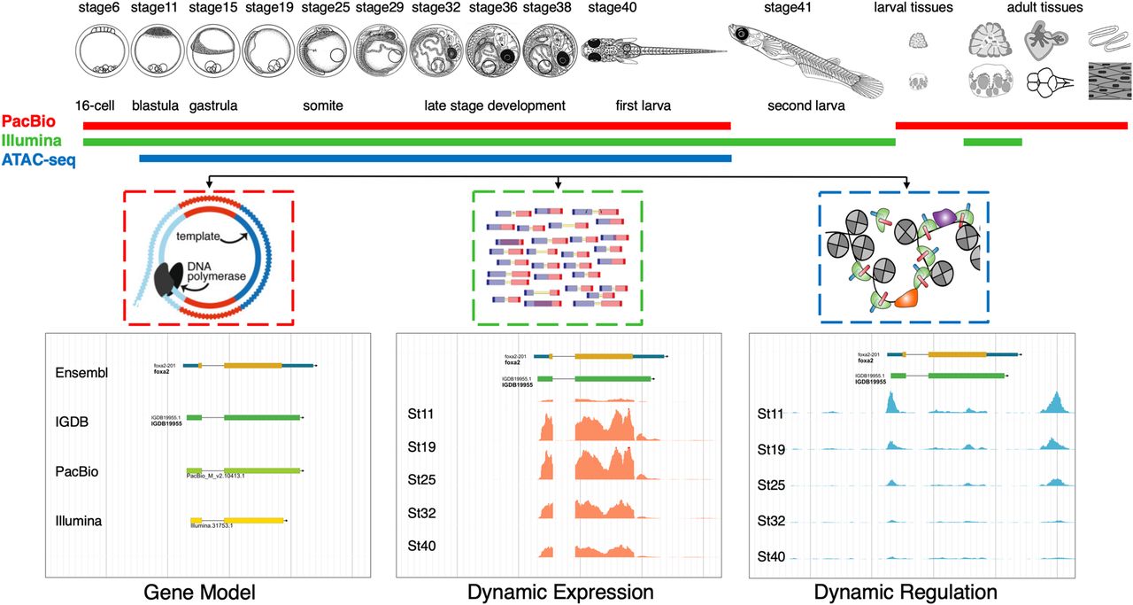 Overview of the study. Samples used are listed on the top, including embryonic stages and adult organs. Samples used for PacBio long-read sequencing (red bar) include 10 embryonic stages and six different adult organs. This data set was used for gene model construction. Samples used for Illumina short-read sequencing (green bar) include 10 embryonic stages, one larva stage, and two adult organs. This data set was used for gene expression quantification. Samples used for ATAC-seq (blue bar) contain nine embryonic stages. The resulted data set was used to define the genomic regulatory dynamics.