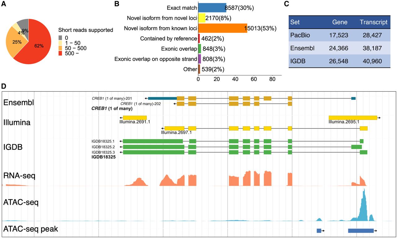 Gene model construction. (A) Splice junctions from the PacBio set validated by the Illumina short reads. Splice junctions are classified into four groups depending on the numbers of short reads supported. (B) Comparison of the PacBio set with the Ensembl set. The largest class is “novel isoforms from known loci.” (C) Numbers of genes and transcripts in three model sets. (D) An example showing the improved annotation of the medaka genome. The Ensembl model is correct overall. The Illumina models missed isoforms or are likely inaccurate owing to transcriptional noise. The IGDB model identified multiple novel isoforms with accurate boundaries. The ATAC-seq clearly showed the activity of the promoter.