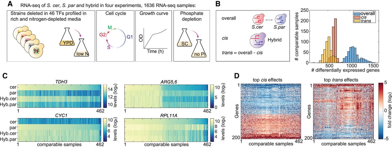 Generating a compendium of comparative transcription profiles. (A) Experimental scheme. The transcription profiles of S. cerevisiae (S. cer), S. paradoxus (S. par), and the interspecific hybrid were measured in four experiments (Methods; Supplemental Table S3). Overall, 1636 samples were acquired, composed of 530–570 samples per species. The “YPD to low nitrogen” experiment was divided into three time points, each comprising 130 samples per species. (B) Hundreds of genes vary in expression level between species in each individual condition. Differentially expressed genes between species (overall), between hybrid alleles (cis), and in trans (overall-cis) were defined via DESeq2 per experiment (log2 fold change > 1, adjusted P-value < 0.05). Presented here is the distribution of genes that pass the fold change threshold in each condition and pass the P-value threshold in at least one experiment. (C) Examples of cis- and trans-varying genes: steady cis effect (TDH3), steady trans effect (CYC1), condition-dependent cis effect (ARG5,6), and condition-dependent trans effect (RPL11A). Shown are the log2-transformed expression levels of the indicated genes in the species and hybrid alleles, as measured in all samples in our data set. Samples were sorted according to expression levels in S. cerevisiae in TDH3, ARG5,6, and RPL11A, and by S. paradoxus in CYC1. (D) Consistency of cis and trans effects across conditions. Shown are log2 fold changes in cis (left) and trans (right) of the top 200 cis- and trans-affected genes.