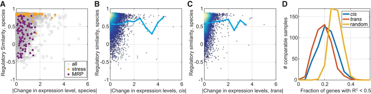 Variation in regulatory dynamics is distinct from variation in expression levels. (A) Regulatory similarity is independent of changes in expression level. Presented are between-species RC scores per gene as a function of the absolute of log2 fold change in expression level between species (median of the 462 comparable samples). Expression modules: stress induced and mitochondrial ribosomal proteins (MRP) are indicated in color. Modules were defined in Ihmels et al. (2002). The correlation between the measures is R = 0.011, P-value = 0.4. (B,C) Regulatory similarity is independent of cis and trans effects. Same as in A, presented are RC as a function of the median cis effect (B) or trans effect (C). Cyan line is the mean RC value per bin. The correlation coefficients between measures are R = −0.02, P-value = 0.17 (B), and R = 0.08, P-value < 1 × 10−10 (C). Color represents density. (D) Differentially expressed genes show a conserved regulatory similarity. We considered the top 100 cis- and trans-varying genes in expression level at each comparable sample and measured the fraction that shows low regulatory similarity (<0.5). Shown are the respective distributions compared to a control in which random genes were picked per comparable sample. ANOVA test for the three distributions result in P-value = 1 × 10−113, ANOVA test for the cis- and trans-distributions result in P-value = 1 × 10−12. This analysis was repeated for different regulatory similarity thresholds as shown in Supplemental Figure S3B.