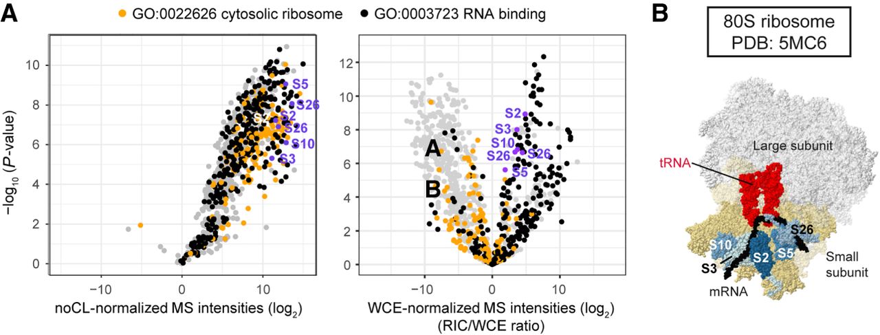 Positioning the mRNA tunnel within ribosomes using RIC/WCE-ratios. (A) Distribution of ribosomal proteins (RPs) in the normalized poly(A)+ interactome. Volcano plot of noCL-normalized (left) or WCE-normalized (right) RIC as in Figure 1D. Proteins annotated as cellular component “cytosolic ribosome” [GO:0022626] are designated in orange, with the molecular function “RNA binding” [GO:0003723] in black. For proteins annotated with both GO terms, GO:0022626 was given precedence. The RPs that were most significantly enriched on poly(A)+ RNA are indicated in blue. Proteins without WCE signal were disregarded (see Supplemental Figs. S1D, S2A). For reference, standard gene names for enriched RPs are given in Supplemental Fig. S2B. (B) Structure of the Saccharomyces cerevisiae 80S ribosome [PDB:5MC6] (Schmidt et al. 2016). RPs with S. pombe orthologs that were highly significantly enriched on poly(A)+ RNA are designated in blue. For reference, the mRNA is colored black, tRNAs bound in the ribosomal A- and P-sites in red, and the small and large ribosomal subunits in beige and white, respectively.