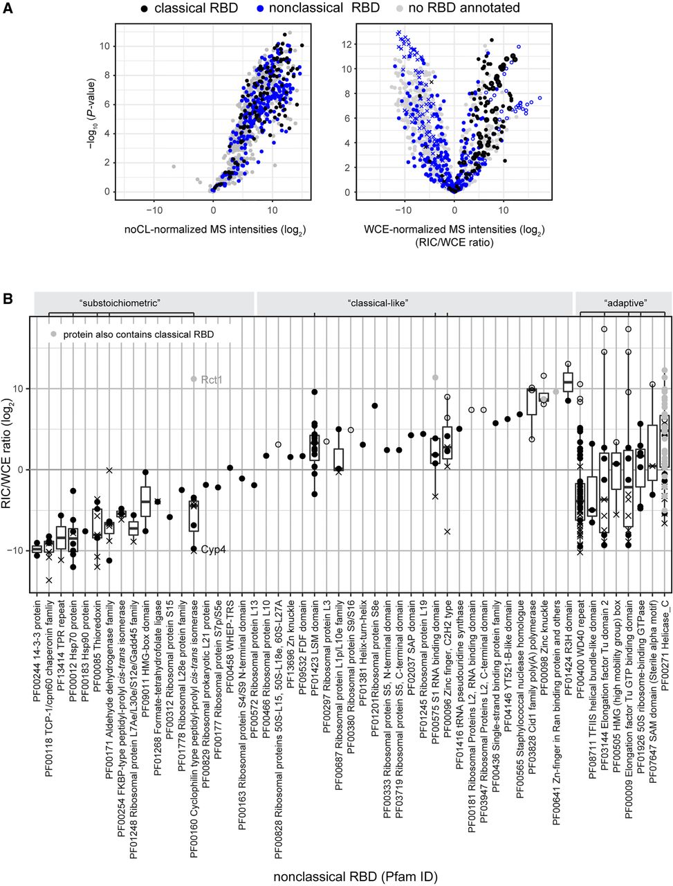 Properties of nonclassical RBDs. (A) Distribution of proteins annotated with a classical or nonclassical RBD in the noCL-normalized (left) and WCE-normalized poly(A)+ RNA interactome (right) as in Figure 1C. Nonclassical RBDs comprise 192 Pfam identifiers derived from the initial human interactome as well as any domain in RBDmap that had at least three peptides supporting it (Castello et al. 2012, 2016; Moore et al. 2018). The complete list of Pfam identifiers used for this analysis can be found in Supplemental Table S2. (B) Boxplot of RIC/WCE ratios for all proteins annotated with a nonclassical RBD that were detected in WT poly(A)+ RIC using symbols to indicate protein populations as in Figure 1D. Proteins that also harbor a classical RBD are marked in gray. Proteins annotated with GO:0022626 [cellular component: cytosolic ribosome] are not included. Abundant nonclassical domains (where at least four different domain-containing proteins were detected in the experiment) were classified as either “substoichiometric,” “classical-like,” or “adaptive,” as indicated above the plot.