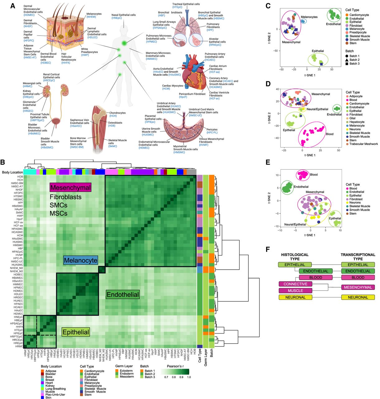 Basic transcriptional programs of human primary cells. (A) Overview of primary cells analyzed in this study and the body location they are extracted from. (B) Hierarchical clustering of human primary cells based on the correlation of gene expression. The clustering in four major clusters is supported by the silhouette analysis and the elbow method (Supplemental Fig. S2A,B). t-SNE of human primary cells based on gene expression measured here (C), on gene expression measured by CAGE by the FANTOM Consortium (D), and on candidate regulatory elements (cREs) by the ENCODE Encyclopedia scored DNase I hypersensitivity signal (E). (F) Correspondence between transcriptionally derived major cell types and classical histological types.