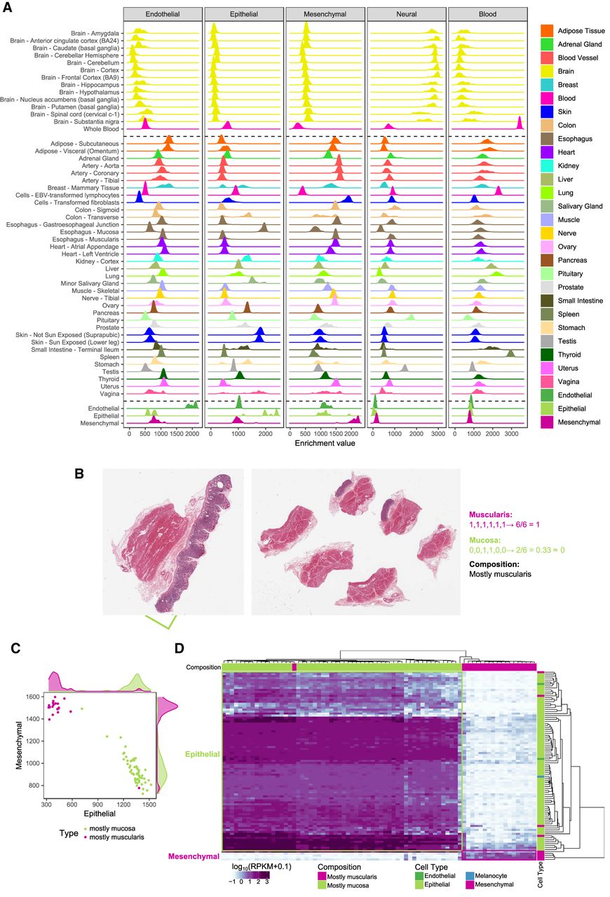 Expression of cell-type-cluster-specific genes in GTEx organs. (A) Enrichment of each major cell type in GTEx tissues, estimated from bulk tissue RNA-seq using the xCell method. As a control, we also include, at the bottom of the plot, the enrichments of the endothelial, epithelial, and mesenchymal primary cells monitored here (Fig. 1B). As expected, since the gene signatures have been derived from these very same cells, endothelial primary cells are heavily enriched in the endothelial type, but not in the other types, epithelial cells in the epithelial type and mesenchymal cells in the mesenchymal type. (B) Example of stomach histological slides, which represent the two main tissue layers and the procedure for the manual annotation of the images based on the presence of those layers. Each GTEx histological image displays up to six tissue slices. For the stomach samples, we scored each slice for the presence (1) or absence (0) of the muscularis and mucosa layers, summed up the values for each layer separately and divided by the number of slices. If the proportion of slices with mucosa layer, or muscularis layer, is more than 50% we classify the entire slide as mc1, or ms1, respectively. If the proportion is lower, we classify the slide as mc0 or ms0. A combined class, for example mc0ms1, is assigned to the slides. Thus, samples labeled mc0ms1 are mostly muscularis, and samples labeled mc1ms0 are mostly mucosa. (C) Enrichment of cells of epithelial and mesenchymal types in stomach samples containing mostly the mucosa (green) or mostly the muscularis (purple) layer. (D) Expression of the cell-type-specific genes that drive the separation of stomach samples in mostly muscularis or mostly mucosa samples. Among discriminant cell-type-specific genes, mucosa-only samples express almost exclusively epithelial-specific genes, whereas muscularis-only samples express exclusively mesenchymal-specific genes.