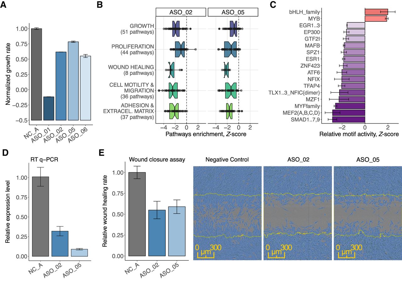 ZNF213-AS1 regulates cell growth, migration, and proliferation. (A) Normalized growth rate across four distinct ASOs (in duplicate) targeting ZNF213-AS1 as compared to six negative control samples (shown in gray). (B) Enrichment of biological pathways associated with growth, proliferation, wound healing, migration, and adhesion for ASO_02 and ASO_05. (C) Most consistently down- and up-regulated transcription factor binding motifs including those for transcription factors known to modulate growth, migration, and proliferation such as for example EGR family, EP300, GTF2I. (D) Knockdown efficiency measured by RT-qPCR after wound closure assay (72 h posttransfection) showing sustained suppression (65%–90%) of ZNF213-AS1. (E) Transfected, replated, and mitomycin C (5 µg/mL)-treated HDF cells were scratched and monitored in the Incucyte imaging system. Relative wound closure rate calculated during the 24 h postscratching shows 40%–45% reduction for the two targeting ASOs (ASO_02 [N = 10] and ASO_05 [N = 13]) as compared to NC_A transfection controls (N = 33, shown in gray) and the representative images of wound closure assay 16 h postscratching.