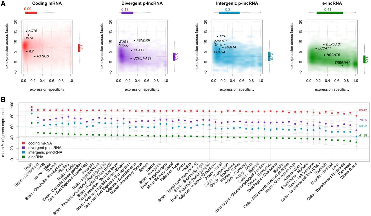Expression profiles across GTEx tissues. (A) Expression level and tissue specificity across four distinct RNA categories. The y-axis shows log2 expression levels representing each gene using its maximum expression in GTEx tissues expressed as transcripts per million (TPM). The x-axis shows expression specificity based on entropy computed from median expression of each gene across the GTEx tissue types. Individual genes are highlighted in the figure panels. (B) Percentage of genes expressed for each RNA category stratified by GTEx tissue facets. The dots represent the mean among samples within a facet and the error bars represent 99.99% confidence intervals. Dashed lines represent the means among all samples.