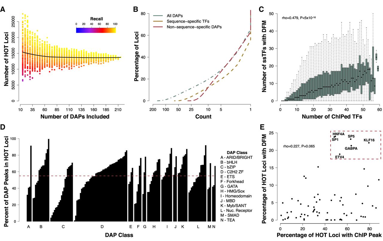 HOT loci are prevalent throughout the genome. (A) Number of loci reaching “HOT” threshold of 25% of unique ChIP-seq peaks after performing random down-sampling (from the original 208) of the number of DAPs included. Each data point represents the result of a random sampling of a specified number of DAPs. The color indicates the recall performance or the percentage of true HOT sites, as defined by >25% of DAPs bound in the full data set, detected with current sample of DAPs. The black line represents the median result of 100 random samples of each number of DAPs as specified by the x-axis. (B) Cumulative distribution function (CDF) showing the proportion of loci containing at least a given number of unique DAP ChIP-seq peaks in HepG2. The green line shows data for all 208 DAPs; the red dashed line, data for nssDAPs; and the yellow dashed line, data for ssTFs. (C) Boxplots showing the number of ChIP-defined DAPs with a corresponding DFM present at the same locus at various levels of DAP coassociation. (D) Barplots indicating the fraction of ChIP peaks for each DAP that fall within HOT loci. Bars are grouped by previously defined DAP classes. The dashed red line indicates the average fraction (55%) of ChIP peaks that fall within a HOT locus across all DAPs. (E) Scatter plot showing the fraction of HOT sites that contain a ssTF ChIP-seq peak and a DFM. ssTFs highlighted in the top right are putative driver TFs present at high proportion of HOT sites.