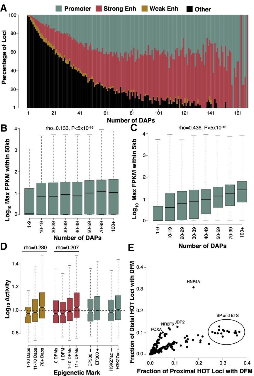 HOT loci are enriched for promoter and enhancer regions near highly expressed genes. (A) IDEAS annotations of loci binned by ChIP-defined DAP associations. Promoter, strong enhancer, and weak enhancer annotations represent 0.27%, 0.35%, and 0.22% of the HepG2 genome, whereas the remaining 99.16% of the genome (largely consisting of quiescent and repressed annotations) was used for the “other” annotation. (B,C) The expression level of the maximally expressed gene neighboring each locus binned by the number of ChIP-defined DAP associations. Plots show loci either distal (>5 kb; B) or proximal (<5 kb; C) to their nearest gene. The sample size of each bin is as follows: 1–9 (N = 194,028), 10–19 (N = 17,148), 20–29 (N = 8685), 30–39 (N = 5876), 40–49 (N = 4578), 50–69 (N = 6532), 70–99 (N = 5351), 100+ (N = 2706). (D) ChIP- and DFM-defined coassociation correlates with activity in a previous high-throughput reporter assay conducted on approximately 2000 selected enhancer regions in HepG2. (E) Scatter plots showing the fraction of distal (>5 kb from a TSS) and proximal (<5 kb from a TSS) HOT sites that contain a DFM for each ssTF in HepG2.