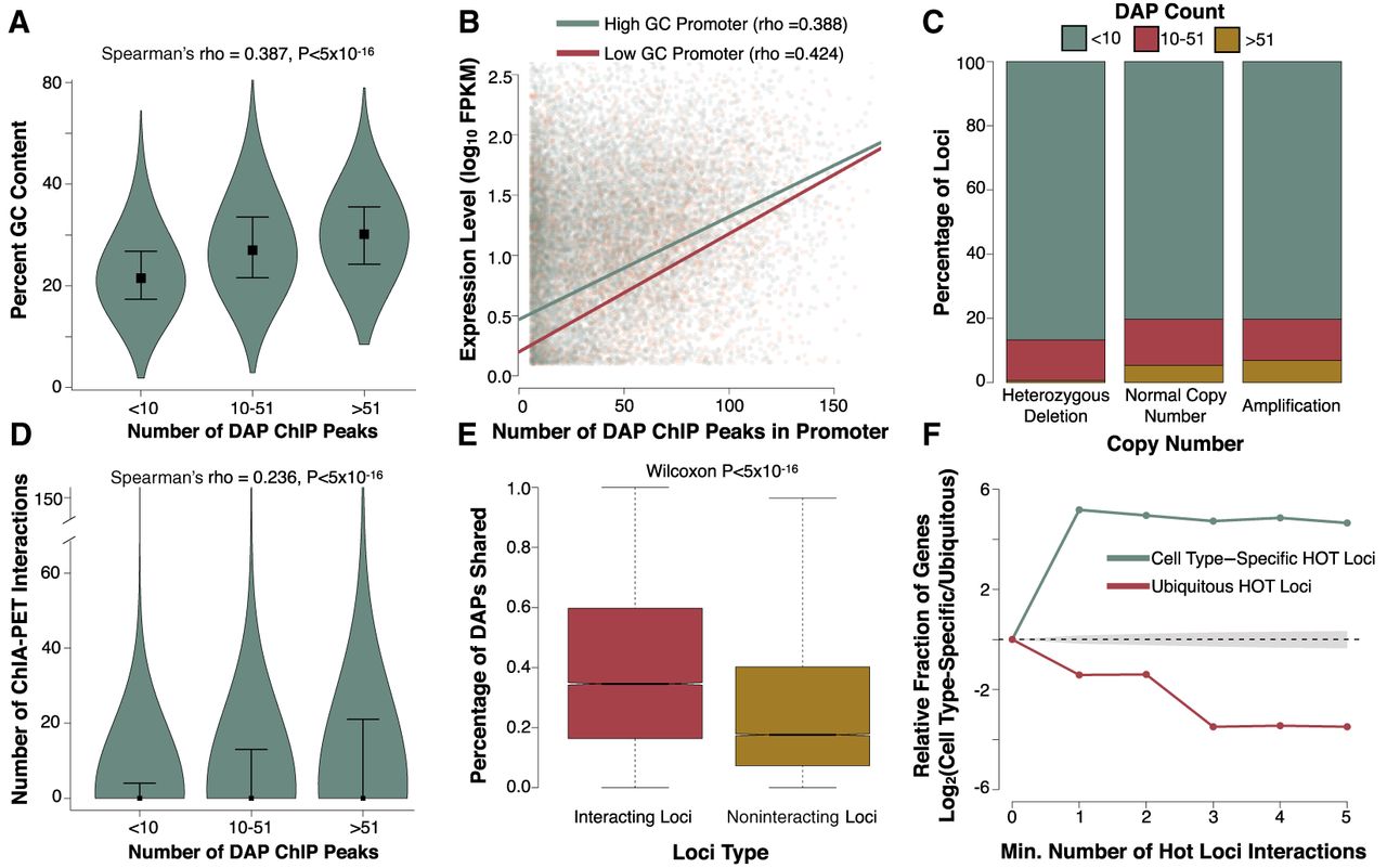 Copy number variation, 3D chromatin structure, and GC content associate with HOT loci. (A) Violin plots showing the GC content of loci with increasing numbers of DAP ChIP-seq peaks. Width of each violin indicates the relative fraction of data contained. Boxes represent the median of each bin and whiskers are drawn to the 25th and 75th percentiles. (B) Scatter plot showing the association between gene expression and DAP ChIP peaks in each genes promoter. Points and trend lines are colored based on promoter GC content. Promoters with GC content in the upper 50th percentile of GC content (high) are colored green, and those in the lower 50th percentile of GC content (low) are colored red. (C) Stacked bar plots showing proportion of loci with various levels of ChIP-derived DAP associations in genomic regions with heterozygous deletions, amplifications, or normal copy number. (D) Violin plots showing the correlation between the number of ChIP-defined DAP associations and the number of Promoter Capture-C interactions. Boxes represent the median of each bin, and whiskers are drawn to the 90th percentile. P-value reported is derived from Spearman's rho correlation of the entire data set. The sample size for each violin from left to right is 194,028, 37,084, and 13,792. (E) Boxplots showing the fraction of DAPs in common between interacting loci and matched noninteracting loci for HepG2 Promoter Capture-C. (F) Line plot indicating the relative fraction (cell type–specific/ubiquitously expressed) of gene promoters with at least the specified number of Promoter Capture-C interactions with other HOT loci. Interactions with cell type–specific loci are shown in green and interactions with loci that are HOT in all three cell lines are shown in red. The gray shaded area represents the 95% confidence, null interval of randomly shuffled loci interactions between cell type–specific and ubiquitously expressed promoters. The 500 cell type–specific and expression-matched ubiquitously expressed genes were identical to those selected in Figure 4.