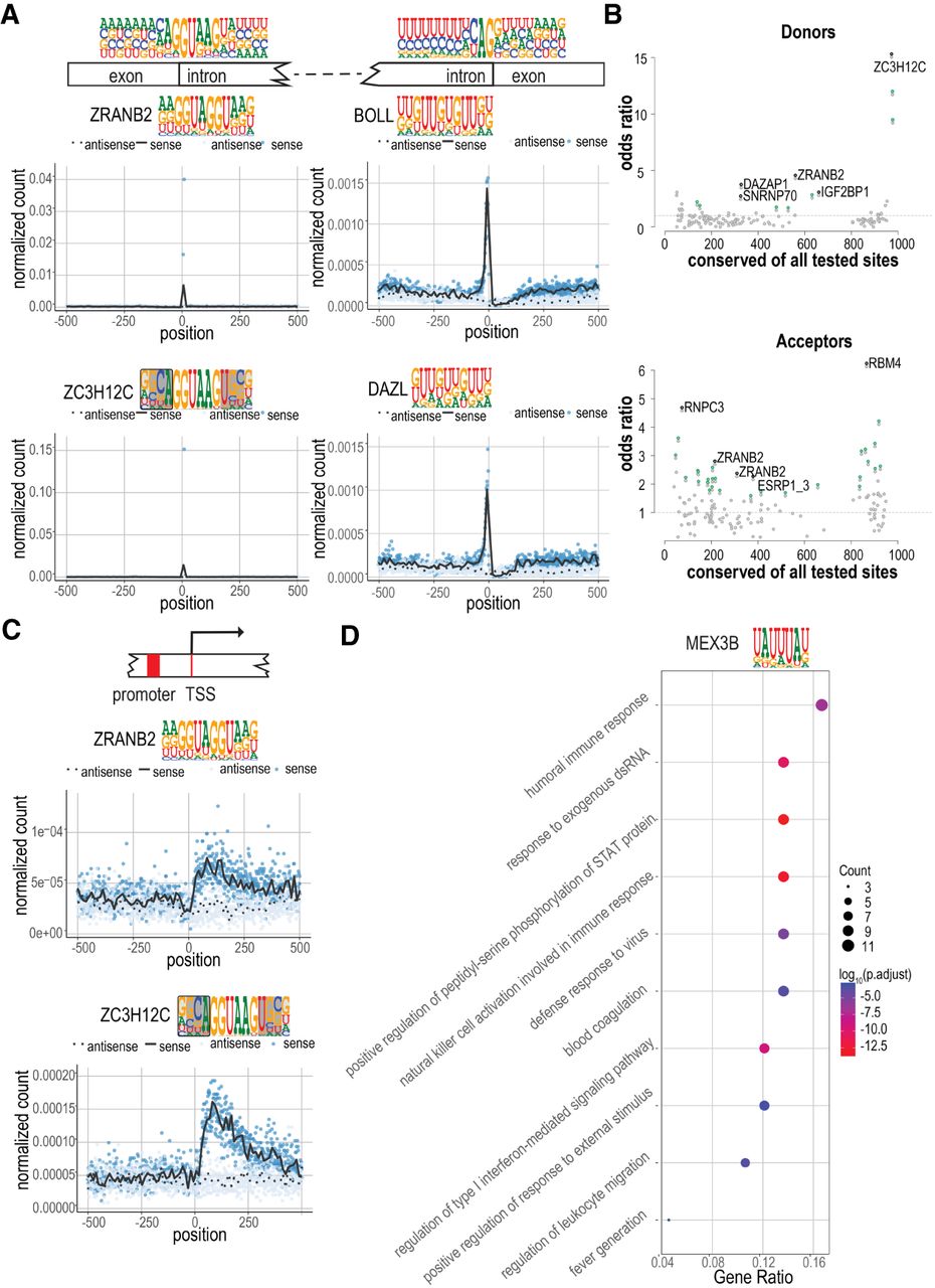 RBP motif matches are conserved and enriched in distinct sequence features and classes of transcripts. (A) Strong enrichment of RBP motif matches at or near the splicing donor and acceptor sites. Mononucleotide frequencies at splice donor and acceptor sites are shown on top, above the gene schematic. (Left) Meta-plots indicate the enrichment of ZRANB2 and ZC3H12C motif matches at splice donor sites. (Right) Enrichment of BOLL and DAZL at splice acceptor sites. Blue dots indicate the number of matches in the sense strand at each base position; black line indicates the locally weighted smoothing (LOESS) curve in 10-base sliding windows. Corresponding values for the antisense strand are shown as light blue dots and dotted black line, respectively. (B) The conservation of motif matches in sense versus antisense strand. Odds ratio of preferential conservation of a match in the sense strand (y-axis) is shown as a function of the total number of conserved motif matches (x-axis) (for details, see Methods). Motifs for which conservation is significantly associated with sense strand (one-sided Fisher's exact test) are shown in green. The five motifs with the smallest P-values are indicated in black and named. (C) Enrichment of ZRANB2 and ZC3H12C motif matches near transcription start sites (TSSs). Note that matches are only enriched on the sense strand downstream from the TSS. (D) Gene Ontology (GO) enrichment of MEX3B motif matches. The top 100 genes with highest motif-matching score density were used to conduct the GO enrichment analysis. The enriched GO terms were simplified by their similarity (cutoff = 0.5). The fraction of genes and their counts in the GO categories are also shown (gene ratio, count, respectively).