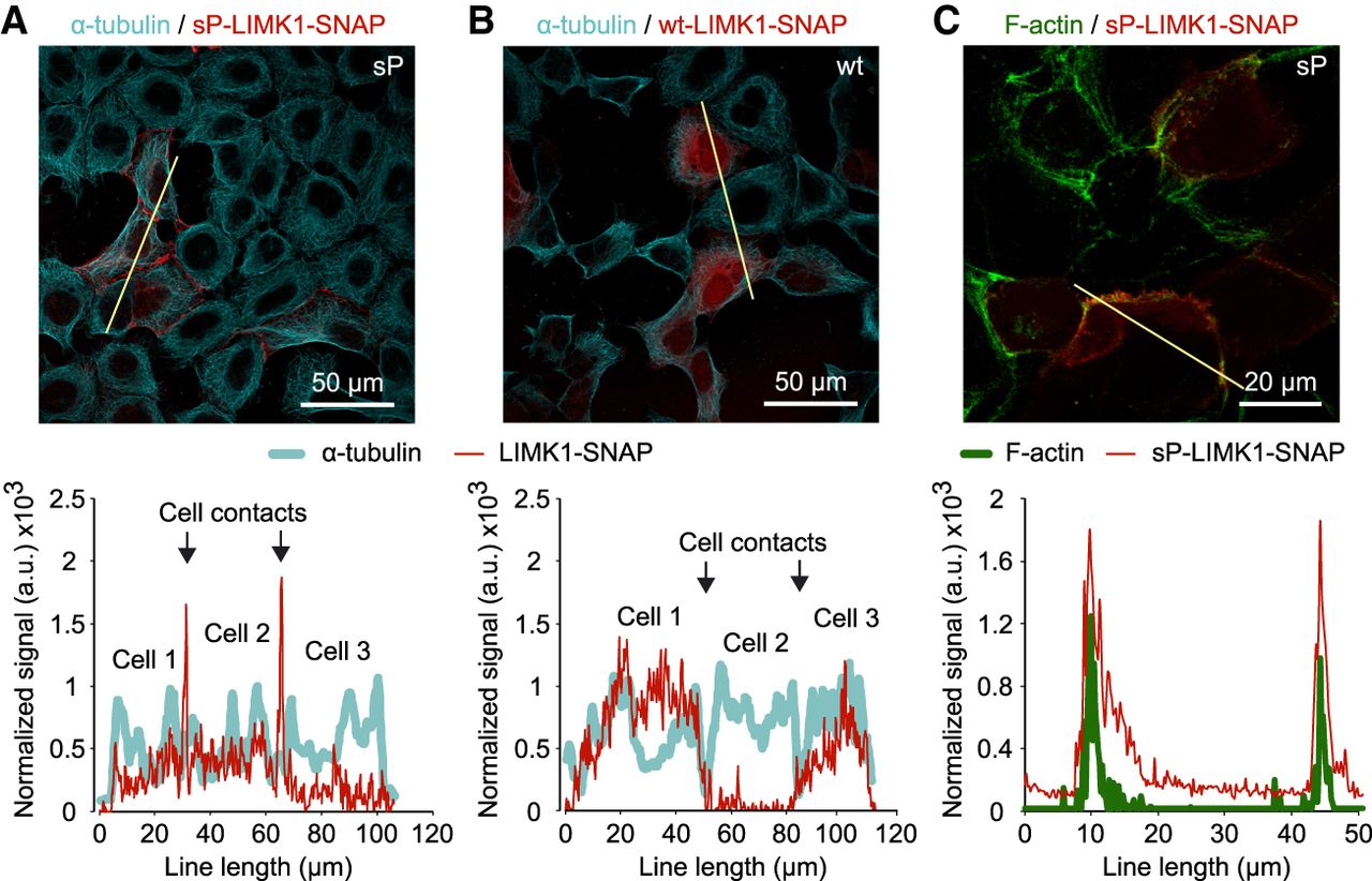 Localization of LIMK1-SNAP-derived products in cells. (A,B) Products from sP and wt constructs, respectively (red, stained with SNAP-Cell 647-SiR), counterstained with α-tubulin/Alexa Fluor 488 antibodies (cyan). (Bottom) Line profile analysis across three contacting cells shows the predominantly peripheral distribution of sP products, in contrast to more uniform cytosolic distribution of the wt products. (C) Colocalization of sP products (red) and F-actin (green, stained with phalloidin-Alexa 546). Images represent stacks of four (A,B) or three (C) focal planes taken with a 5 µm step.