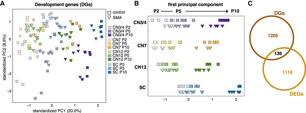 Evaluation of the developmental state of SMA somatic motor neuron somas. (A) PCA with development-related genes (DGs, 1341 genes) of all somatic motor neurons in control and SMA. (B) Plot of PC1 alone to better visualize the “age component.” (C) Venn diagram depicting overlap between DGs and all differentially expressed genes between control and SMA (DEGs, no fold-change cutoff, Padj < 0.05) per cell type and time point.