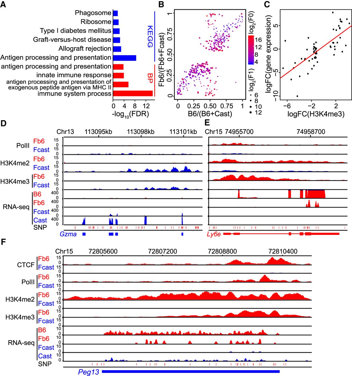 Both genetic and epigenetic regulations shape the gene expression in hybrid mouse. (A) GO enrichment for differentially expressed genes between B6 and Cast. (B) Relative expressions in parents and haploids of differentially expressed genes between Fb6 and Fcast. Dot size represents average expression level of Fb6 + Fcast. Blue to red represents average expression level of B6 + Cast. (C) Allele-specific H3K4me3 is positively correlated with allele-specific gene expression in the hybrid. Each point represents a biased ChIP-seq peak and its regulated gene (R = 0.85, P-value = 1.2 × 10−13). (D) Cast/Fcast-specific epigenetic modifications and expression near Gzma. (E) B6/Fb6-specific epigenetic modification and expression near Ly6e. (F) Maternal imprinted gene Peg13 only showed paternal-specific active epigenetic modifications in the hybrid.