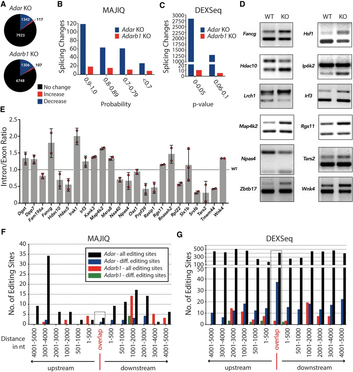 ADAR or ADARB1 deficiency causes transcriptome-wide changes in splicing patterns. (A) Pie charts depicting differential editing analysis in Adar- or Adarb1-deficient cortex. Editing levels remain steady (black), increase (red), or decrease (blue). (B) Histogram showing local splicing variations (LSVs) identified by MAJIQ tool in ADAR (Adar-) or Adarb1-deficient cortex binned by MAJIQ probability score. (C) Histogram showing differential exon/intron usage events identified by DEXSeq in Adar- or Adarb1-deficient cortex binned by DEXSeq adjusted P-value. (D) RT-PCR validation of LSVs predicted by MAJIQ in Adar-deficient cortex resolved by agarose gel electrophoresis. (E) qPCR validation of LSVs predicted by MAJIQ in Adar-deficient cortex. Data shown are the mean inclusion to exclusion ratio in Adar KO (±SD). (F) Histogram showing ADAR and ADARB1 differential editing sites found in the indicated distances of ADAR- and ADARB1-dependent LSV events identified by MAJIQ in the cortex; editing sites are binned (±5 kb) by significant chromosomal coordinates. Editing sites that lie exactly on/within the differentially spliced regions have been highlighted and binned as “Overlap.” Only those editing sites that were found in the ±5-kb window have been plotted. (G) Histogram showing ADAR and ADARB1 differential editing sites identified in the indicated distances of ADAR- and ADARB1-dependent differential exon/intron usage identified in the cortex; editing sites are binned (±5 kb) by significant chromosomal coordinates. Editing sites that lie exactly on/within the differentially spliced regions have been highlighted and binned as “Overlap.” Only those editing sites that were found in the ±5-kb window have been plotted.