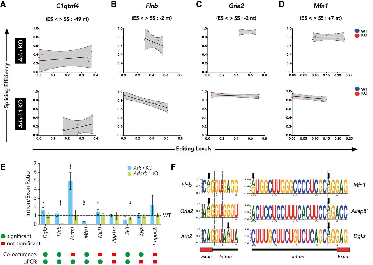 Nearby editing and splicing events are frequently linked. (A–D) Linear regression of co-occurrence analysis comparing editing levels and splicing levels of C1qtnf4, Flnb, Gria2, and Mfn1 in Adar KO and Adarb1 KO cortex samples. WT samples are shown in blue and KO samples are shown in red. The editing site position (ES) relative (upstream: +, or downstream: −) to the splice site position (SS) is given. (E) Histogram showing qPCR validation of targets identified by co-occurrence analysis in Adar KO and Adarb1 KO cortex. Data shown are mean inclusion to exclusion ratio (±SD). Statistical test performed with Student's t-test; (*) P < 0.05, (**) P < 0.01, (***) P < 0.001. A comparison of the significance found in the co-occurrence analysis of NGS data by Fisher's exact test and the output of the qPCR experiments as calculated by Student's t-test. Green dots = significant; red squares = not significant. (F) Schematic representing examples of positions of editing sites in the 5′ splice sites of Flnb, Gria2, and Xrn2 as well as in the 3′ splice sites of Mfn1, Akap8l, and Dgkz. Black arrows show the location of editing sites. A dotted box highlights the canonical 5′ GU and 3′ AG splice sites.