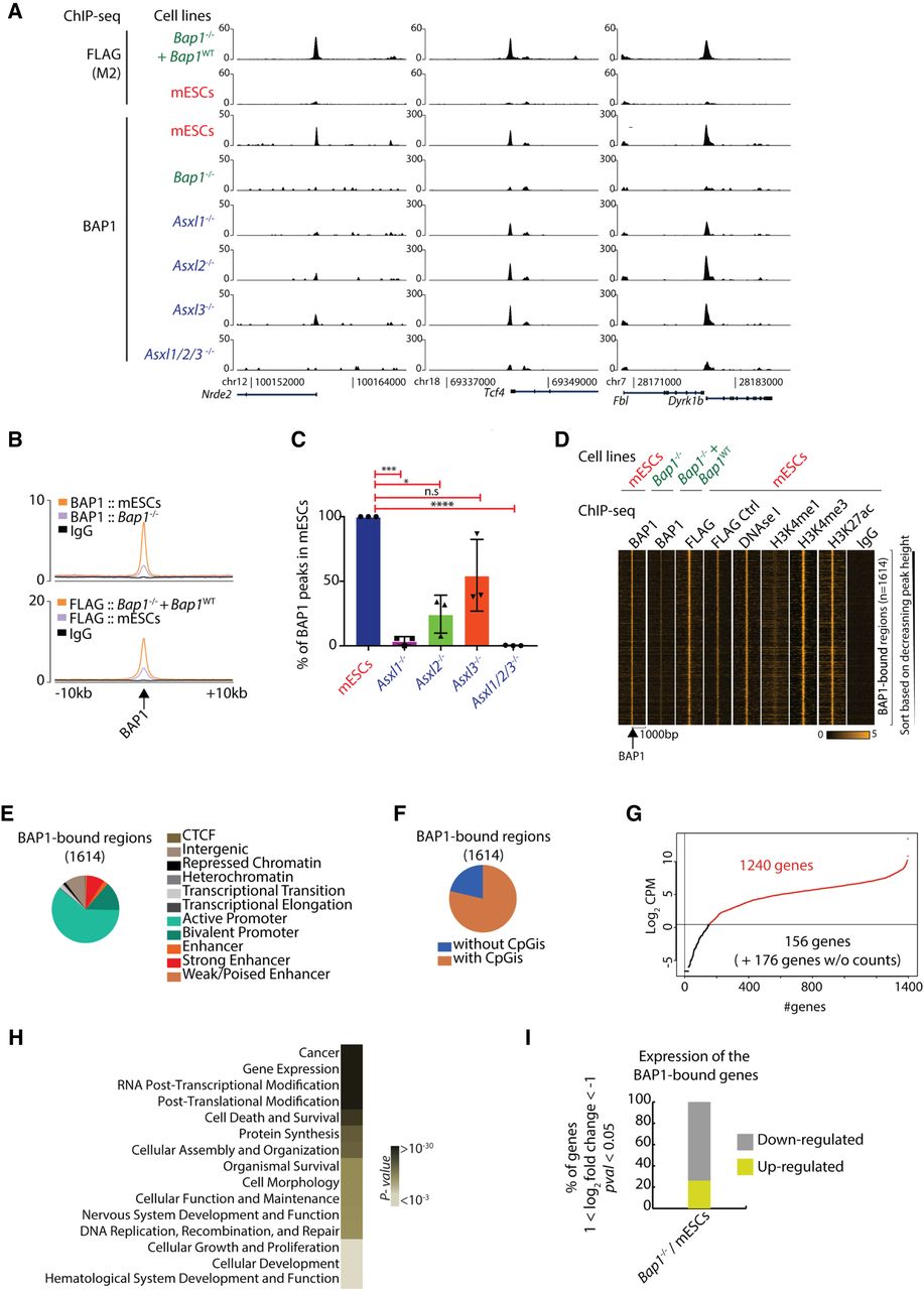 BAP1 binds to active genes involved in key cellular processes in an ASXL1/2/3-dependent manner. (A) Screenshots for three representative loci showing ChIP-seq for 3×FLAG-BAP1 in Bap1−/−+ Bap1WT and wild-type mESCs (control; upper panel) and ChIP-seq for BAP1 in wild-type mESCs, Bap1−/−, Asxl1−/−, Asxl2−/−, Asxl3−/−, and Asxl1/2/3−/− mESCs. (B) Average profile of the BAP1 ChIP-seq in wild-type and Bap1−/− mESCs (upper) and 3×FLAG-BAP1 ChIP-seq in Bap1−/−+ Bap1WT and wild-type mESCs (bottom) signals in 20 kb around the BAP1-enriched regions. (C) Identification of the (percentage) BAP1 regions remaining in Asxl1−/−, Asxl2−/−, Asxl3−/−, and Asxl1/2/3−/− mESCs compared to wild-type mESCs (determined by three independent biological replicates). Unpaired t-test with Welch correction. (*) P-value = 0.0124; (***) P-value = 0.0004; (****) P-value < 0.0001. (D) Heat maps illustrating the signal of the indicated ChIP-seq profiles (BAP1, FLAG for BAP1, DNase I, H3K4me1, H3K4me3, H3K27ac, and IgG) in 2 kb around the 1614 identified BAP1-enriched regions. (E) Hidden Markov analysis for the 1614 BAP1 positions in mESCs and organization in the 11 indicated categories. (F) Identification of the enrichment of CpG islands (CpGi) for the 1614 BAP1 positions. (G) Log2-normalized mean counts of mapped reads for the 1572 BAP1-bound genes; 1240 genes are expressed and have an adequate number of mapped reads (log2 CPM ≥ 0.5). (H) BAP1 target genes as divided by the most significant GO terms. (I) Differential expression profile of the statistically significant BAP1-bound genes in Bap1−/− mESCs versus wild-type mESCs. The criteria for the selected genes are: 1 ≤ log2 fold change ≤ −1, P-value ≤ 0.05, log2 CPM in mESCs ≥ 0.5 (down-regulated genes) or log2 CPM in KO ≥ 0.5 (up-regulated genes).