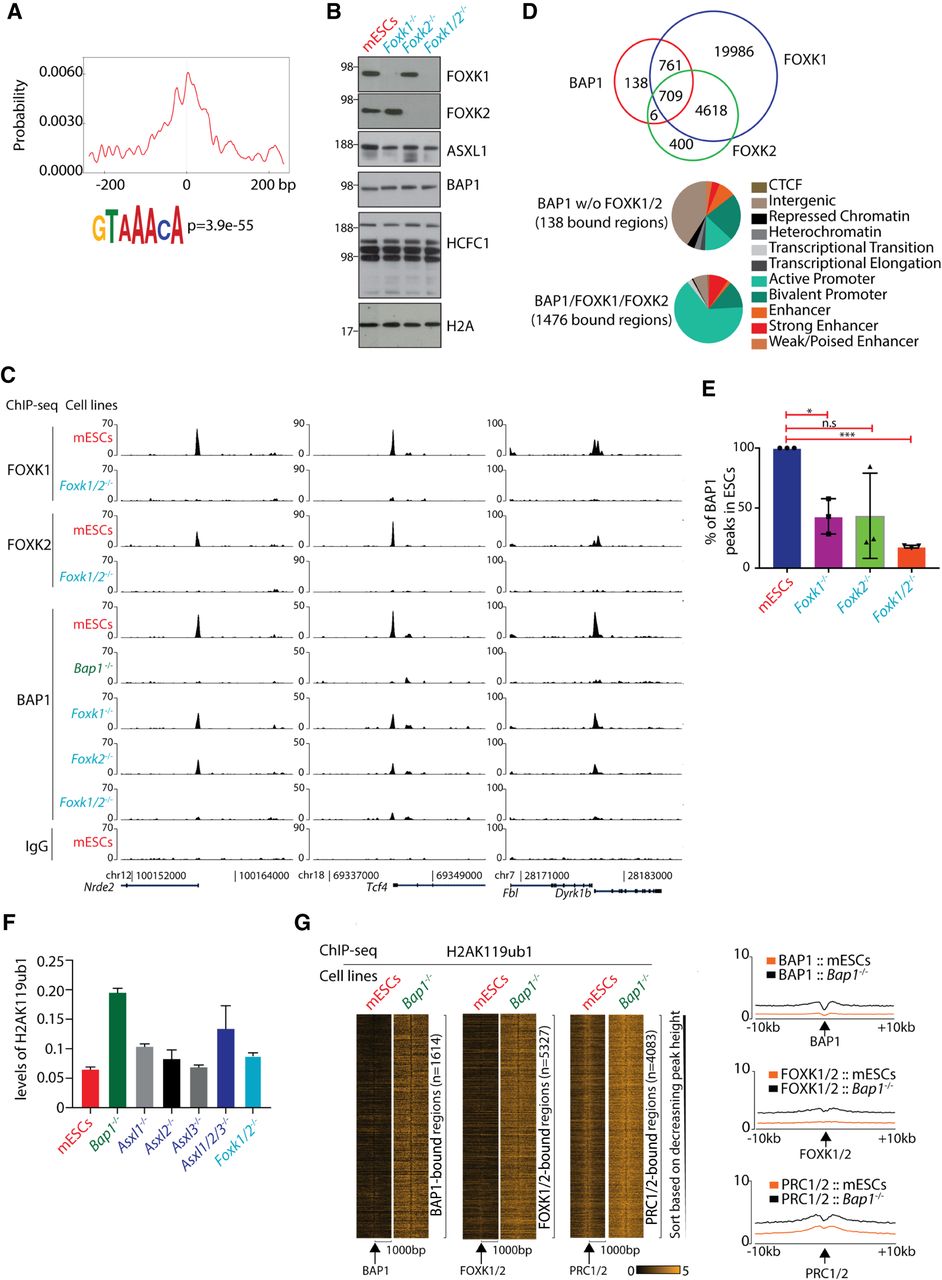 Site-specific binding of BAP1 to chromatin is dependent on FOXK1 and FOXK2. (A) Motif analysis of the top 5000 3×FLAG-Bap1 binding regions revealed an enrichment for the FOX motifs centralized around the BAP1 peaks. (B) Western blots demonstrating the expression levels of FOXK1, FOXK2, ASXL1, BAP1, HCFC1, and H2AK119ub1 in wild-type mESCs, Foxk1−/−, Foxk2−/−, and Foxk1/2−/− mESCs. (C) ChIP-seq screenshot for three representative loci showing the binding of FOXK1 and FOXK2 in wild-type and Foxk1/2−/− mESCs and BAP1 in wild-type mESCs, Bap1−/−, Foxk1−/−, Foxk2−/−, and Foxk1/2−/− mESCs. (D) Euler diagrams showing the overlap between BAP1, FOXK1, and FOXK2 peaks, in wild-type mESCs showing that 1476 BAP1 regions colocalize with FOXK1/2 (top panel). Hidden Markov analysis for the 138 BAP1-bound not overlapping with FOXK1/2 binding in mESCs and the 1476 BAP1/FOXK1/FOXK2-bound regions and the organization of these regions into the 11 indicated categories (bottom panel). Based on hypergeometric test, the overlap between BAP1 and FOXK1 (P-value < 1.89 × −7) and the overlap between BAP1 and FOXK2 (P-value < 3.248 × −264) are statistically significant. (E) Identification of the (percentage) BAP1 peaks remaining in Foxk1−/−, Foxk2−/−, and Foxk1/2−/− mESCs compared to wild-type mESCs. Unpaired t-test with Welch correction. (*) P-value = 0.0215; (***) P-value < 0.0001. (F) The relative H2AK119ub1 levels in wild-type mESCs, Bap1−/−, Asxl1−/−, Asxl2−/−, Asxl3−/−, Asxl1/2/3−/−, and Foxk1/2−/− mESCs, as determined by mass spectrometry. (G) Heat maps illustrating enrichments of H2AK119ub1 in 2 kb around the BAP1, FOXK1/2, and PRC1/2 peaks in wild-type and Bap1−/− mESCs. The H2AK119ub1 ChIP-seqs were performed in triplicate and the first replicate is depicted. In the right panel, the average profiles of the H2AK119ub1 ChIP-seq signals in 20 kb around the BAP1, FOXK1/2, and PRC1/2 peaks are depicted.