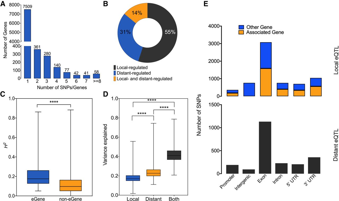 Characterization of eQTL associations. (A) Expression variance explained by all SNPs for each gene. (B) Number of associated genes per SNP in significant eQTL associations. (C) The distribution of genes regulated by local and/or distant SNPs. (D) Broad sense heritability for genes with and without significant eQTL associations. (E) Genomic location of SNPs with significant eQTL associations. Promoters are defined as 500 bp upstream of the gene. Data were analyzed using Kruskal–Wallis test followed by Dunn's multiple comparison test. Significance is indicated by asterisks: (****) P-value < 0.0001.