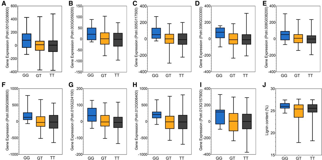 MYB125 is a trans-acting regulator of genes from the lignin biosynthesis pathway. Single marker regression analysis between the local-regulatory SNP of MYB125 (with the smallest P-value) and the expression of (A) 4CL3 (P-value = 0.015); (B) CSE (P-value = 0.019); (C) F5H (P-value = 0.005); (D) C3′H (P-value = 0.003); (E) PAL2 (P-value = 0.014); (F) CCoAOMT1 (P-value = 0.015); (G) PAL4 (P-value = 0.003); (H) COMT1 (P-value = 0.003); and (I) C4H1 (P-value = 0.013). (J) Single marker regression analysis between the local-regulatory SNP of MYB125 (with the smallest P-value) and the lignin content percentage (P-value = 0.003). Boxplot for expression of genes from the lignin biosynthesis pathway (A–J) and lignin content percentage (I) plotted as an effect of genotypes at the SNP, with the smallest P-value, in the region of MYB125. The horizontal line represents the median, and the vertical lines mark the range of the minimum and maximum values.