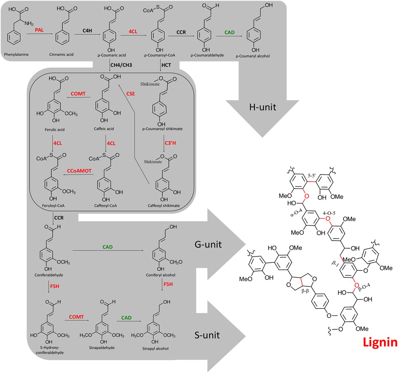 Summary of the lignin biosynthetic pathway in higher plants. Enzymes are abbreviated as follows: (PAL) phenylalanine ammonia-lyase; (C4H) cinnamate 4-hydroxylase; (4CL) 4-coumarate:CoA ligase; (C3H) p-coumarate 3-hydroxylase; (C3′H) p-coumarate shikimate 3-hydroxylase; (HCT) shikimate/quinate hydroxycinnamoyl transferase; (CCR) cinnamoyl-CoA reductase; (CAD) cinnamyl alcohol dehydrogenase; (CSE) caffeoyl shikimate esterase; (COMT) caffeic acid O-methyltransferase; (CCoAOMT) caffeoyl-CoA O-methyltransferase; (F5H) ferulate 5-hydroxylase. Enzymes in red were found to be directly connected to MYB125 in the gene expression network and to be differentially expressed when MYB125 is overexpressed in poplar transgenic roots. The enzyme in green was not directly connected to MYB125 in the gene expression network, but single regression analysis showed significant association with the local-regulatory SNPs of MYB125. The box includes the most recent step discovered in the lignin biosynthesis pathway in plants.