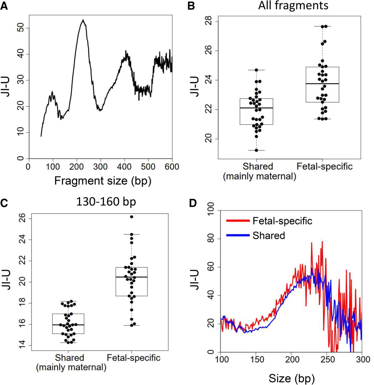 Jagged ends in plasma DNA of pregnant women. (A) The profile of JI-U across different sizes of plasma DNA fragments, ranging from 50 bp to 600 bp. (B) The JI-U between shared DNA molecules (mainly of maternal origin) and fetal-specific DNA molecules without size selection. (C) The JI-U between shared DNA molecules and fetal-specific DNA molecules within a range of 130 to 160 bp. (D) JI-U across different sizes for shared and fetal-specific plasma DNA molecules. The JI-U represents the jagged index deduced from unmethylated signals at CG sites.