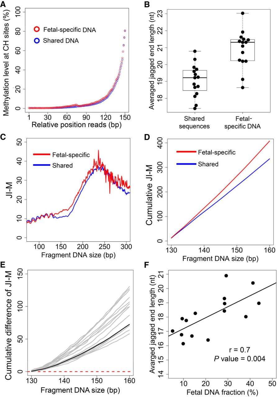 Differential jagged ends between fetal and maternal DNA molecules revealed by the incorporation of methylation at CH sites. (A) Methylation level at CH sites in the relative positions of read1 and read2 for shared and fetal-specific DNA molecules. (B) Averaged jagged end lengths between shared and fetal-specific DNA molecules. (C) Relationship between JI-M deduced by methylation at CH sites in read2 and plasma DNA fragment sizes. (D) The cumulative JI-M between fetal-specific and shared DNA molecules. (E) The cumulative difference in JI-M, from 130 bp to 160 bp, between fetal and shared (mainly of maternal origin) DNA sequences. The black line represents the cumulative difference in jaggedness index between the shared (mainly of maternal origin) and fetal-specific DNA molecules pooled from all pregnant subjects. The positive values indicate relative higher jaggedness for molecules below a particular size cutoff. (F) The correlation between the average jagged end length within 130–160 bp and fetal DNA fraction. The JI-M represents the jagged index deduced from the methylated signals at CH sites.