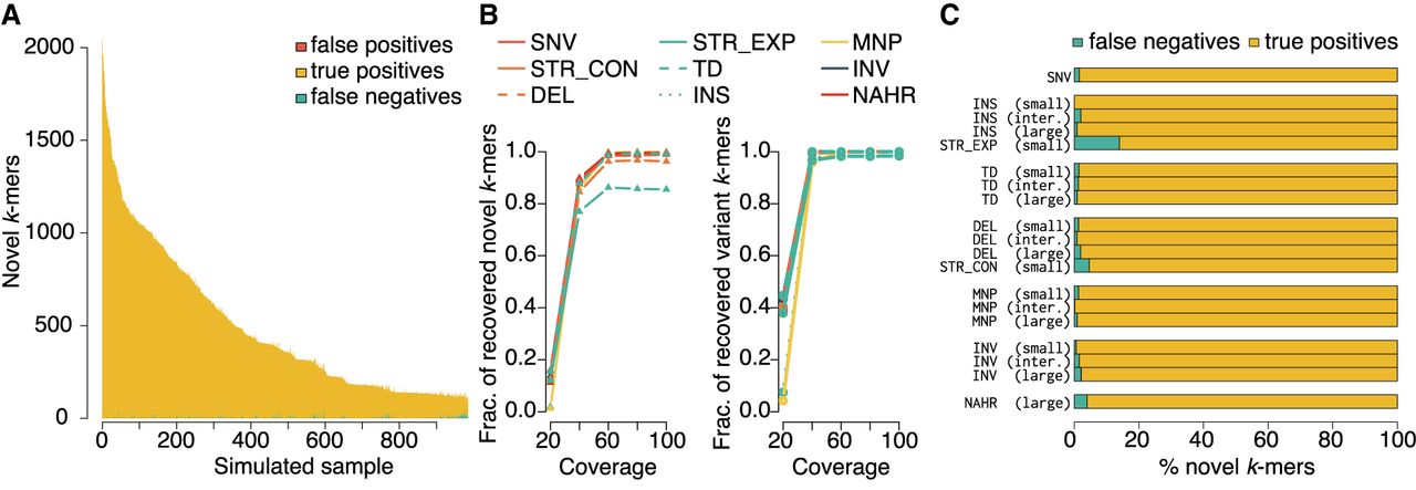 Simulation-based evaluation of novel k-mer detection and subsequent reassembly quality for contigs spanning novel k-mers in error-containing short-read data. (A) Number of k-mers in the progeny correctly identified as novel (true positives), undetected (false negatives), and misidentified as novel (false positives). (B) Novel and variant k-mer recovery for all in silico progeny at simulated mean coverages of 20×, 40×, 60×, 80×, and 100×. (C) For all simulated alleles, the fraction assembled completely (i.e., wholly contained within a single contig) and incompletely (i.e., only partially reconstructed).