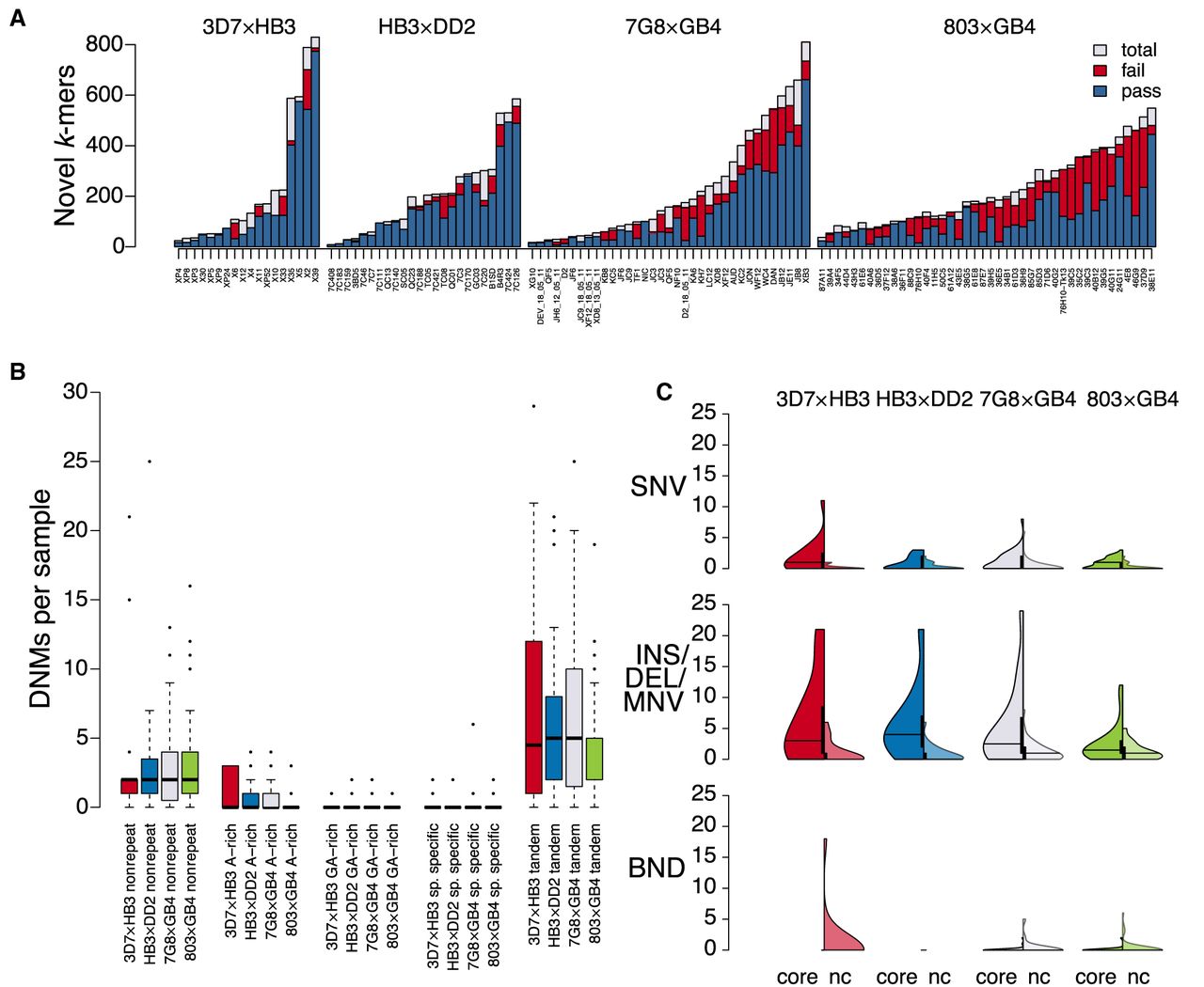 Per-sample DNM discovery metrics in 119 P. falciparum progeny. (A) Novel k-mers per cross and sample (gray bars). For those contained within successfully assembled variants, k-mers in variant passing filters are shown in green; the rest are shown in red. (B) Per-cross DNM sample distributions for mutations appearing in repetitive regions of the respective parental genomes. (C) Violin plots showing DNM sample distributions per cross, split by those in core genomic regions (left) and noncore regions (right).